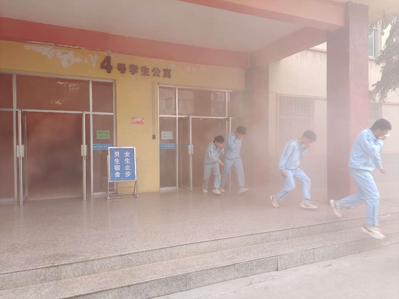 14時(shí)40分,疏散演練正式開始。隨著火災(zāi)警報(bào)響起,各學(xué)生公寓樓冒出滾滾濃煙,公寓管理人員迅速組織學(xué)生有序疏散。在軍訓(xùn)教官、學(xué)生管理人員的引導(dǎo)下,同學(xué)們按照動作要領(lǐng),用濕毛巾捂住口鼻,俯身彎腰按照安全出口指示牌指引快速、有序從疏散通道撤離到體育場,整個過程緊張有序、實(shí)用性強(qiáng),收到了預(yù)期效果。