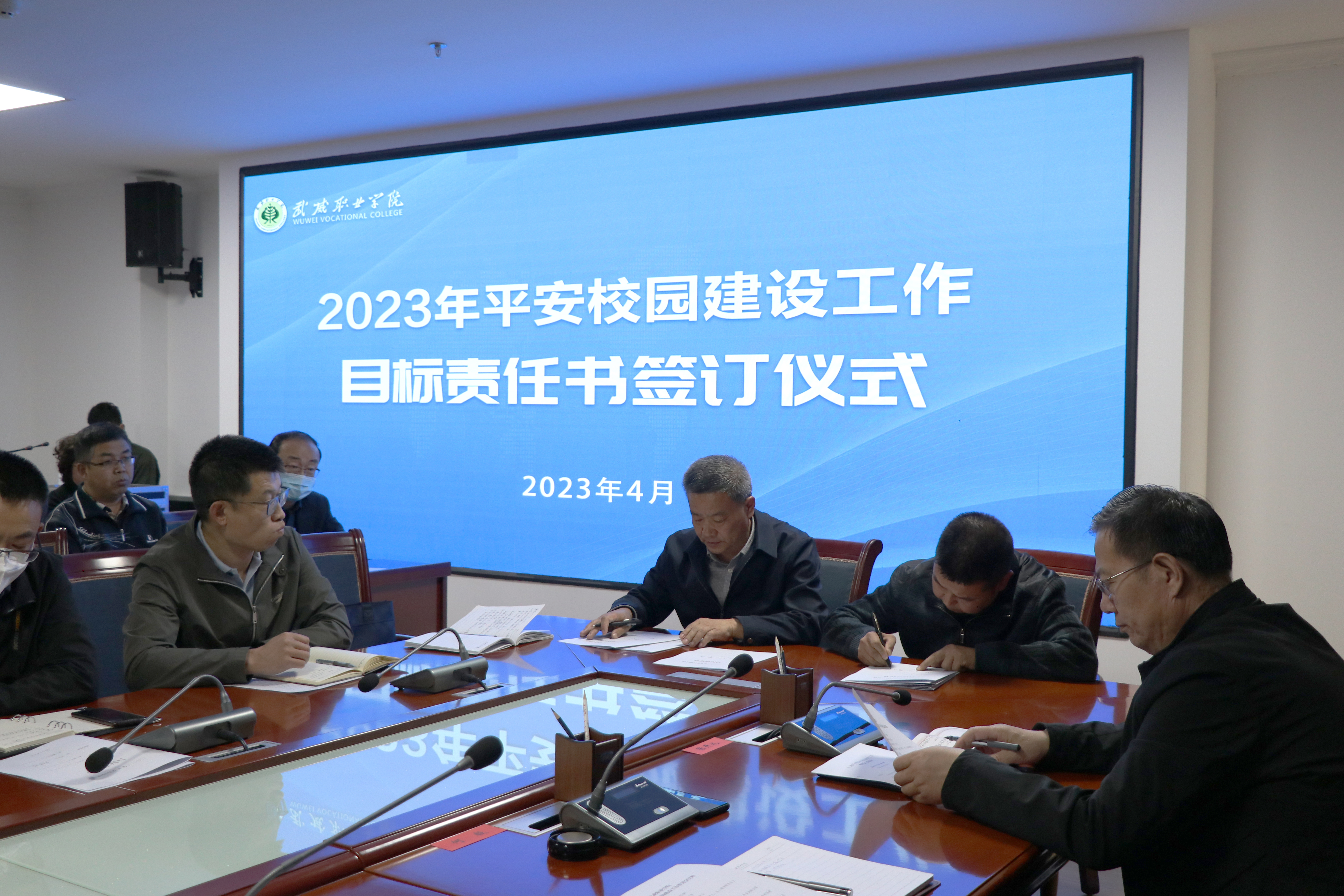趙明與各部門、二級(jí)學(xué)院簽訂了2023年平安校園建設(shè)工作目標(biāo)責(zé)任書。王守云結(jié)合學(xué)校實(shí)際,對(duì)2023年平安校園建設(shè)工作作了安排。