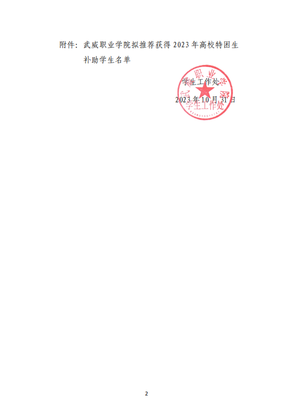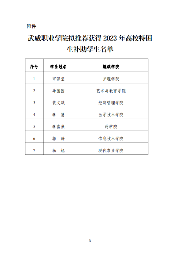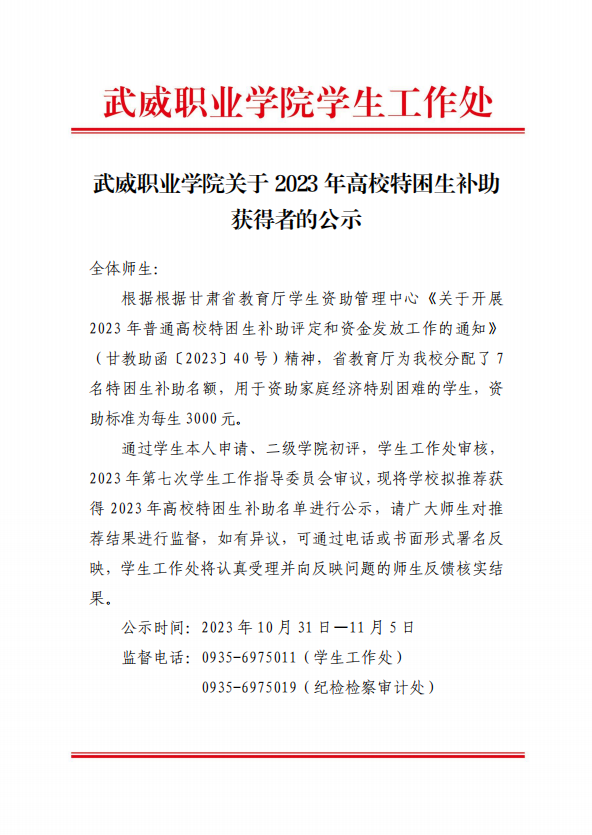 武威職業(yè)學院關于2023年高校特困生補助獲得者的公示
