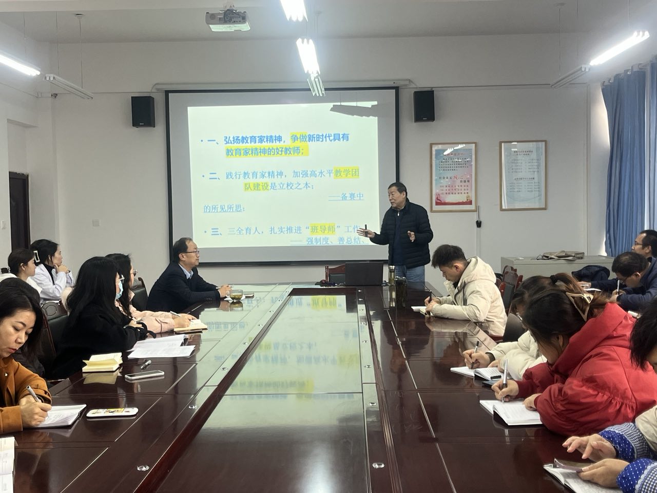 楊存忠教授主要從“弘揚(yáng)教育家精神,爭(zhēng)做新時(shí)代具有教育家精神的好老師”、“踐行教育家精神,加強(qiáng)高水平教學(xué)團(tuán)隊(duì)建設(shè)”、“三全育人,扎實(shí)推進(jìn)班導(dǎo)師工作”以及“如何上好一堂課”四部分展開(kāi)。楊存忠教授解讀了中國(guó)特有教育家精神的內(nèi)涵;闡述了堅(jiān)持師德師風(fēng)第一標(biāo)準(zhǔn),大力弘揚(yáng)教育家精神的重要意義和基本要求;結(jié)合典型案例,以案為戒,勉勵(lì)新時(shí)代教師既精通專(zhuān)業(yè)知識(shí)、做好“經(jīng)師”,又涵養(yǎng)德行、成為“人師”,努力做精于傳道授業(yè)解惑的“經(jīng)師”和“人師”的統(tǒng)一者。楊存忠教授還就如何上好一堂課與老師們進(jìn)行了深入交流。