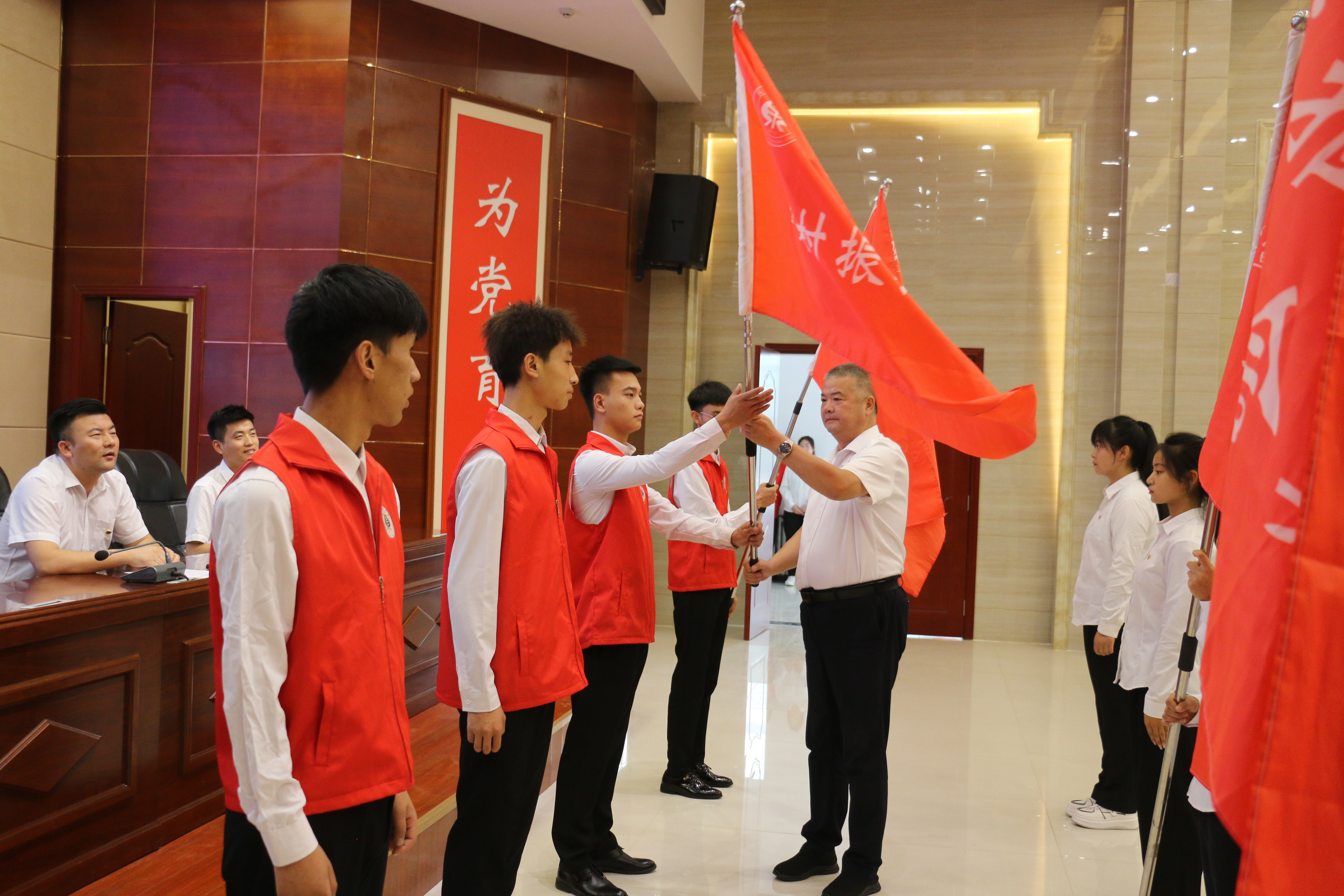 王守云為各實踐服務(wù)團隊授旗。志愿者代表候昊燁代表全體隊員莊嚴承諾,遵守紀(jì)律,克服困難,團結(jié)協(xié)作,全力以赴,力爭圓滿地完成預(yù)定的各項實踐任務(wù)。指導(dǎo)教師代表姚盈老師發(fā)言,介紹了“直播帶貨-非遺傳承”鄉(xiāng)村振興促進團的實踐計劃情況,號召老師和同學(xué)們深入基層一線,用腳步丈量祖國大地,用眼睛發(fā)現(xiàn)中國精神,用耳朵傾聽人民呼聲,用內(nèi)心感應(yīng)時代脈搏。