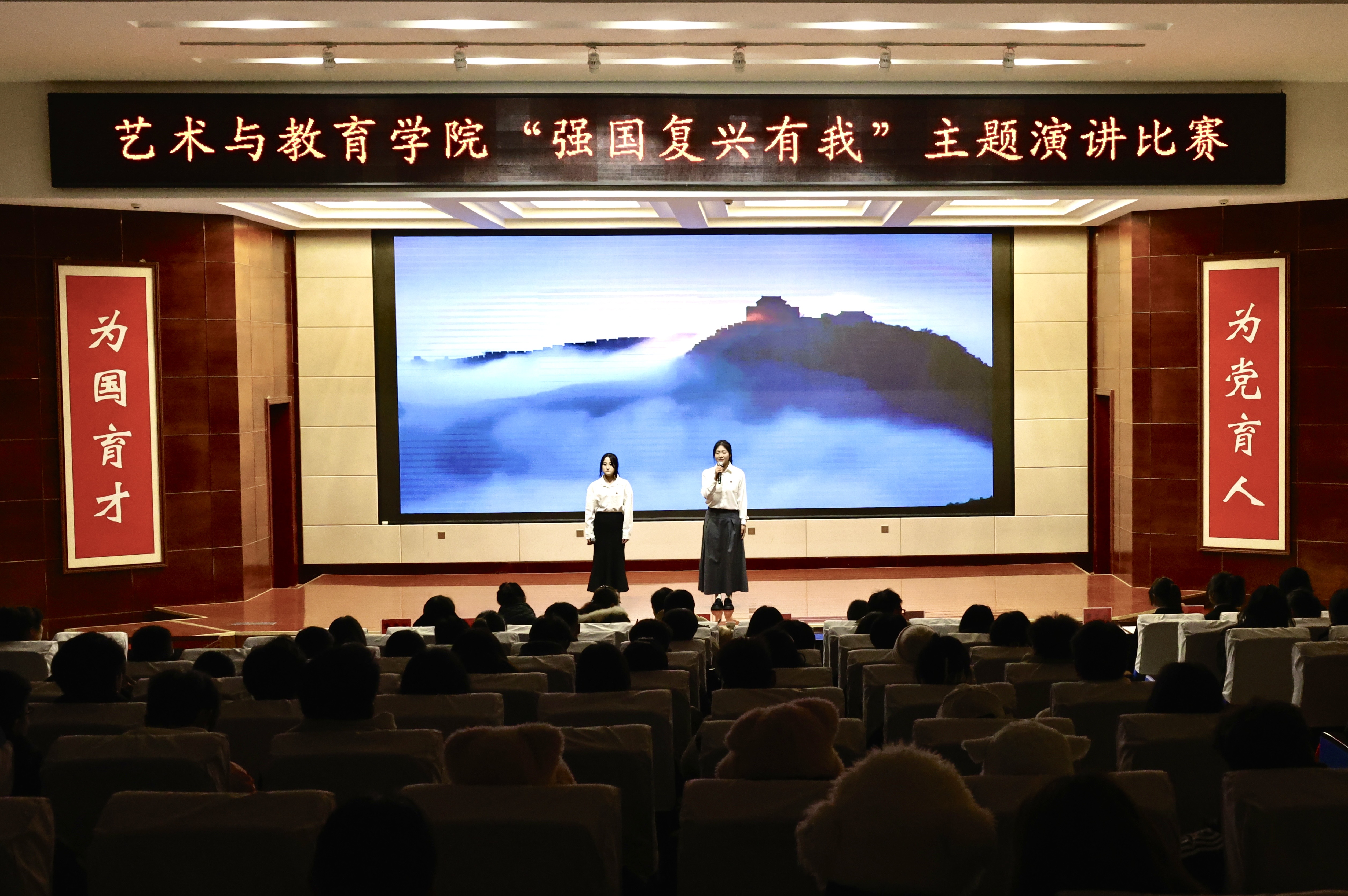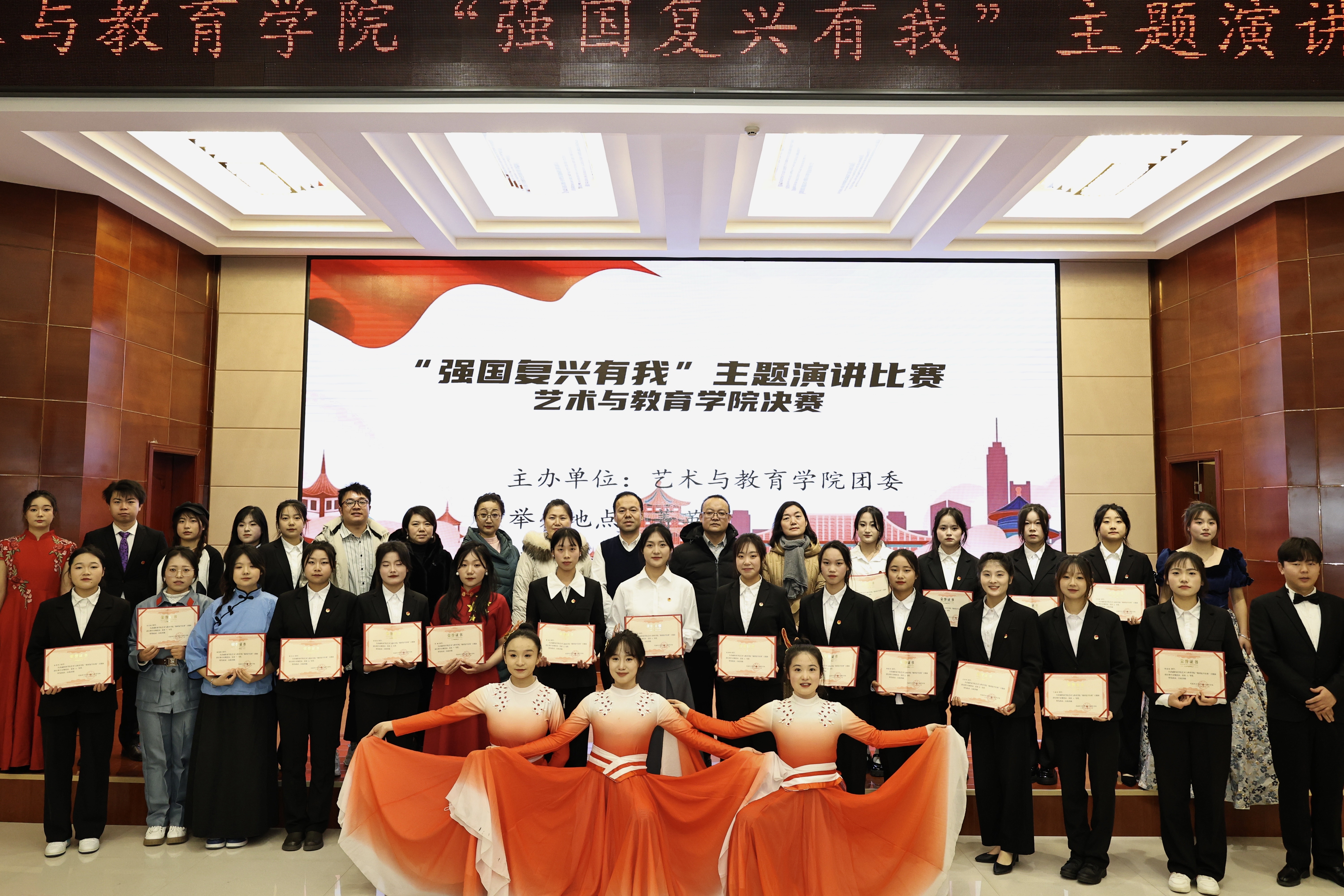 為弘揚愛國主義精神,激發(fā)學(xué)生愛國情懷,12月20日晚,藝術(shù)與教育學(xué)院團委在菁英廳舉辦“強國復(fù)興有我”主題演講比賽。學(xué)院200余名師生觀看了比賽。
