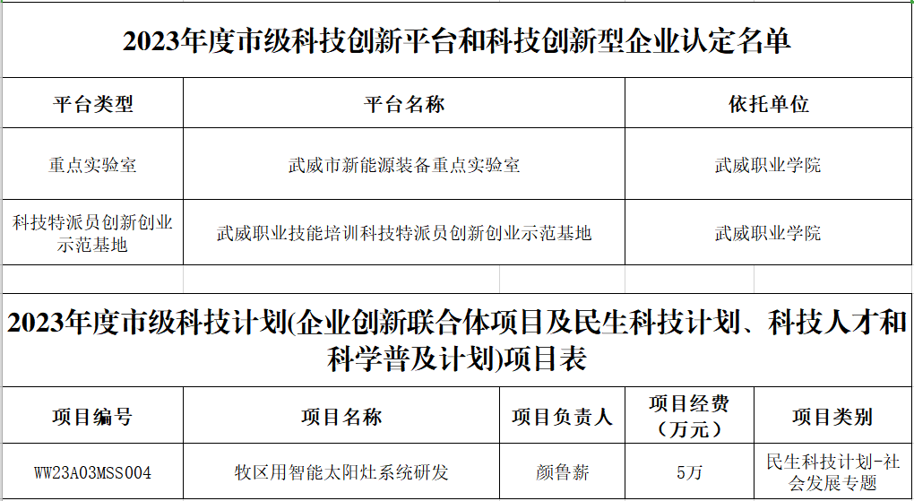 學(xué)校喜獲武威市新能源裝備重點實驗室、科技特派員創(chuàng)新創(chuàng)業(yè)示范基地