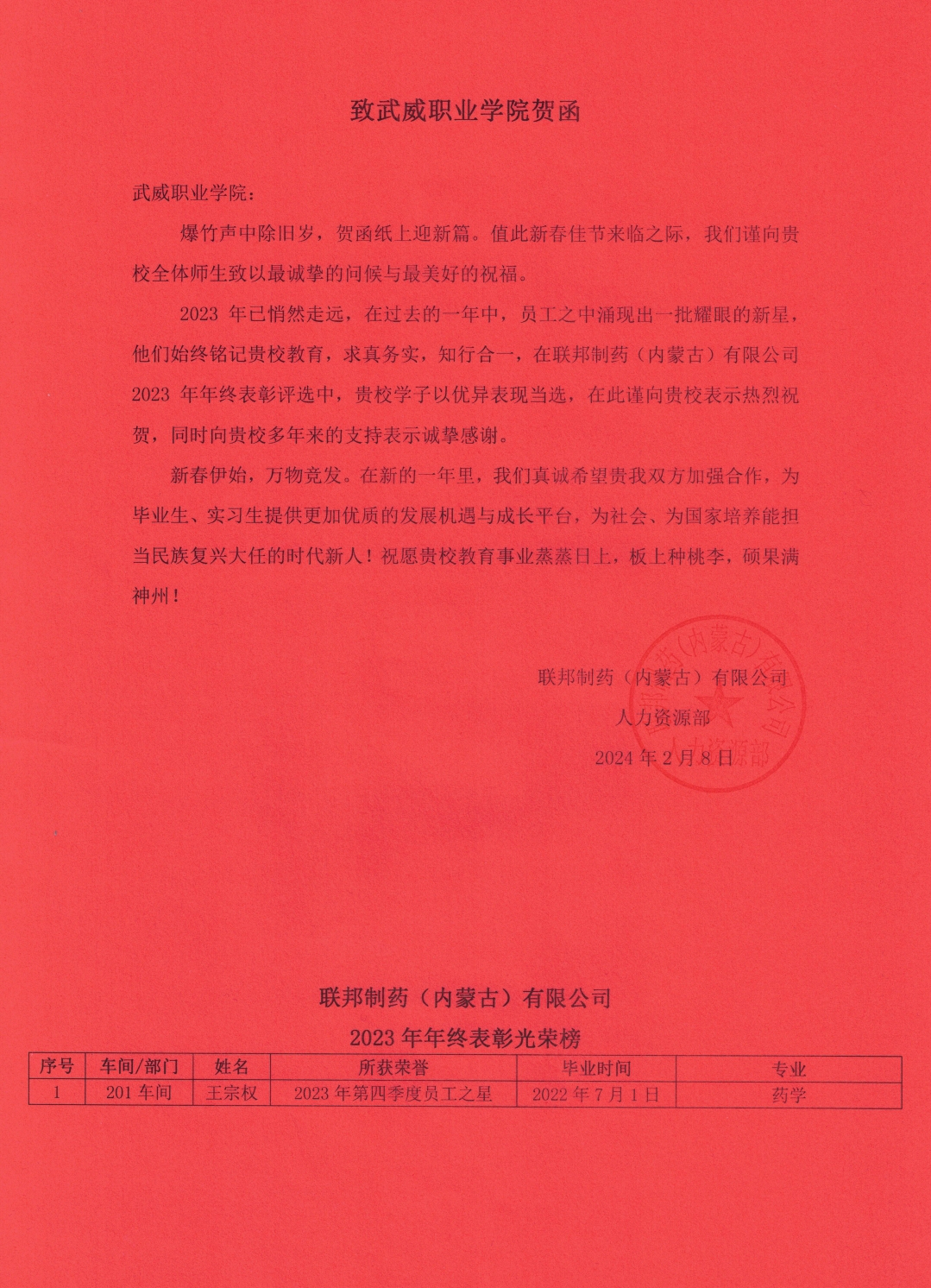 2月初,聯(lián)邦制藥(內(nèi)蒙古)有限公司向?qū)W校發(fā)來賀信,在信中感謝學(xué)校輸送眾多優(yōu)秀畢業(yè)生,表彰畢業(yè)生在工作中取得的優(yōu)異成績。其中,2022屆畢業(yè)生王宗權(quán)榮獲企業(yè)2023年第四季度員工之星。此外,聯(lián)邦制藥(內(nèi)蒙古)有限公司表示愿與學(xué)校繼續(xù)加強校企合作,共同為畢業(yè)生提供更加優(yōu)質(zhì)的發(fā)展機遇與成長平臺,為社會、為國家培養(yǎng)能擔(dān)當(dāng)民族復(fù)興大任的時代新人!
