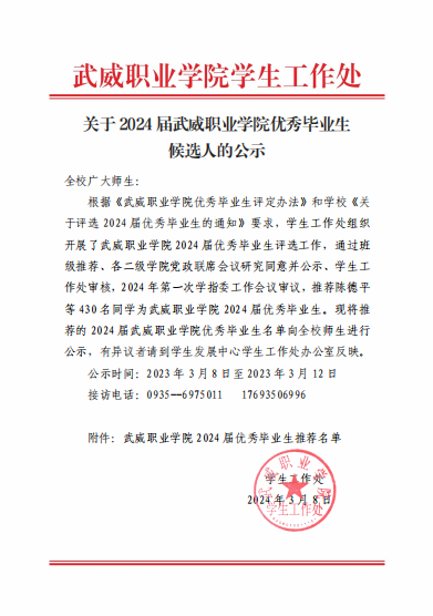關于2024屆武威職業(yè)學院優(yōu)秀畢業(yè)生候選人的公示