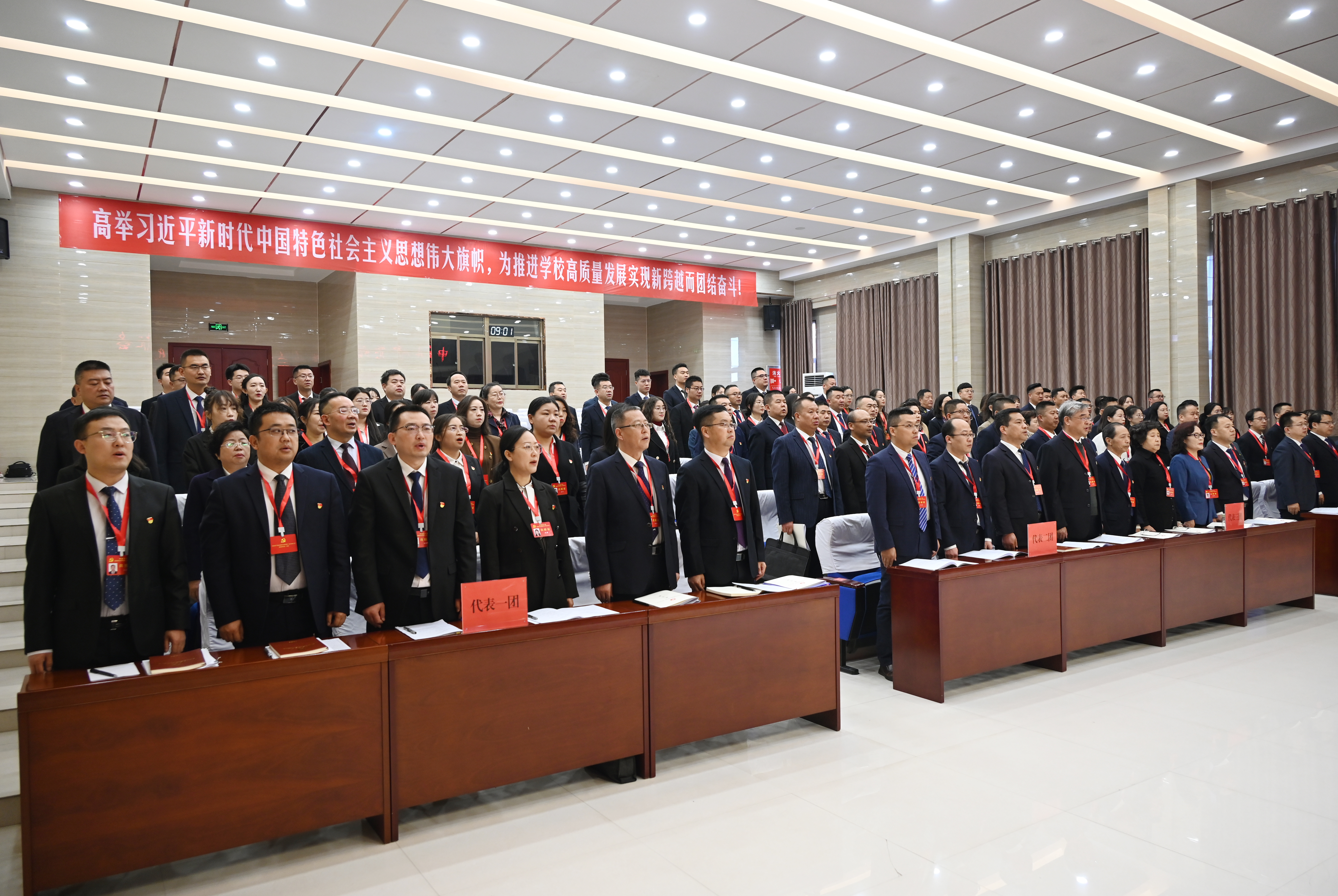 上午9時,大會在莊嚴的國歌聲中拉開帷幕。王宏宣布中國共產黨武威職業(yè)學院第二次代表大會正式開幕。