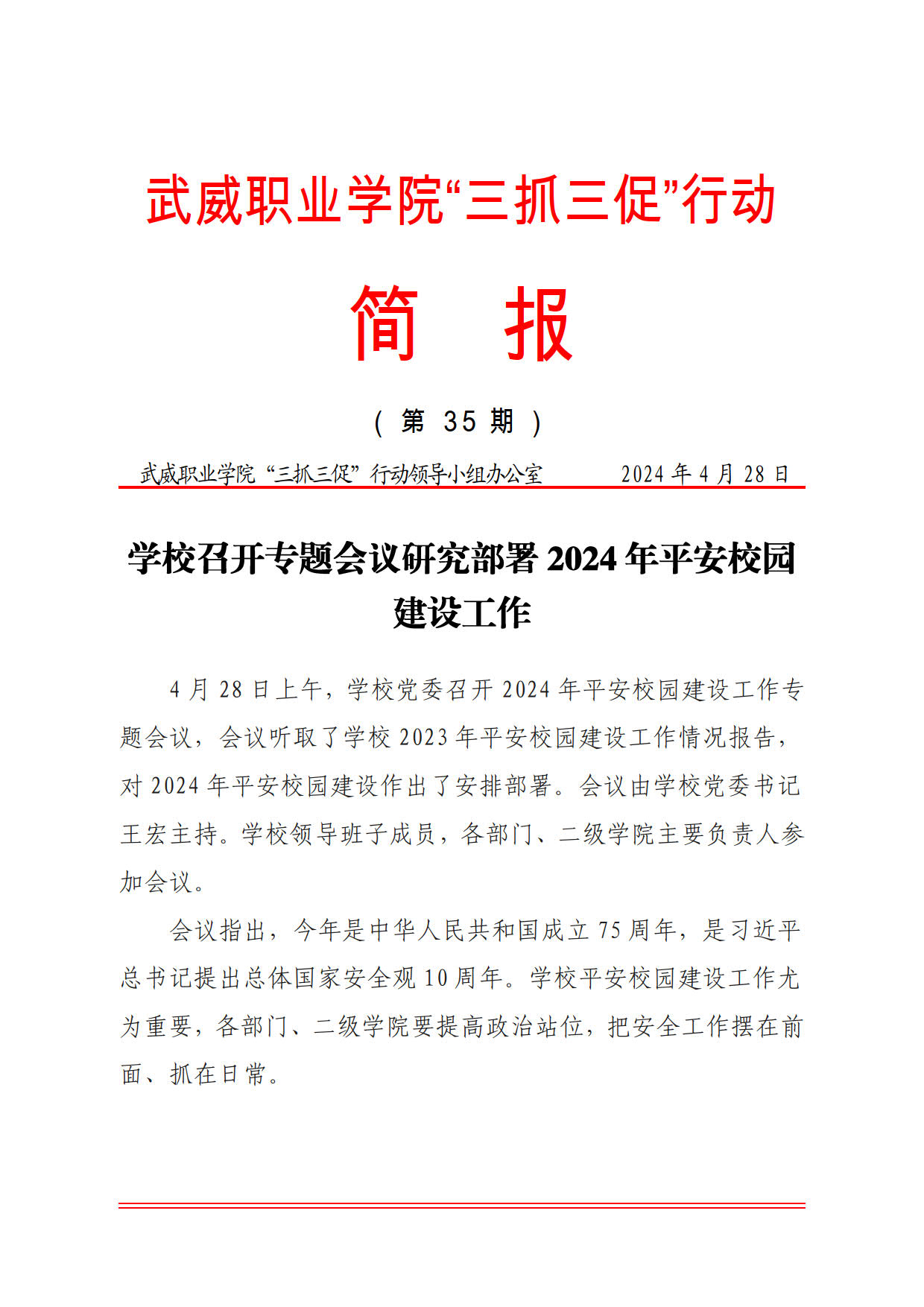簡(jiǎn)報(bào)第35期:學(xué)校召開專題會(huì)議研究部署2024年平安校園建設(shè)工作