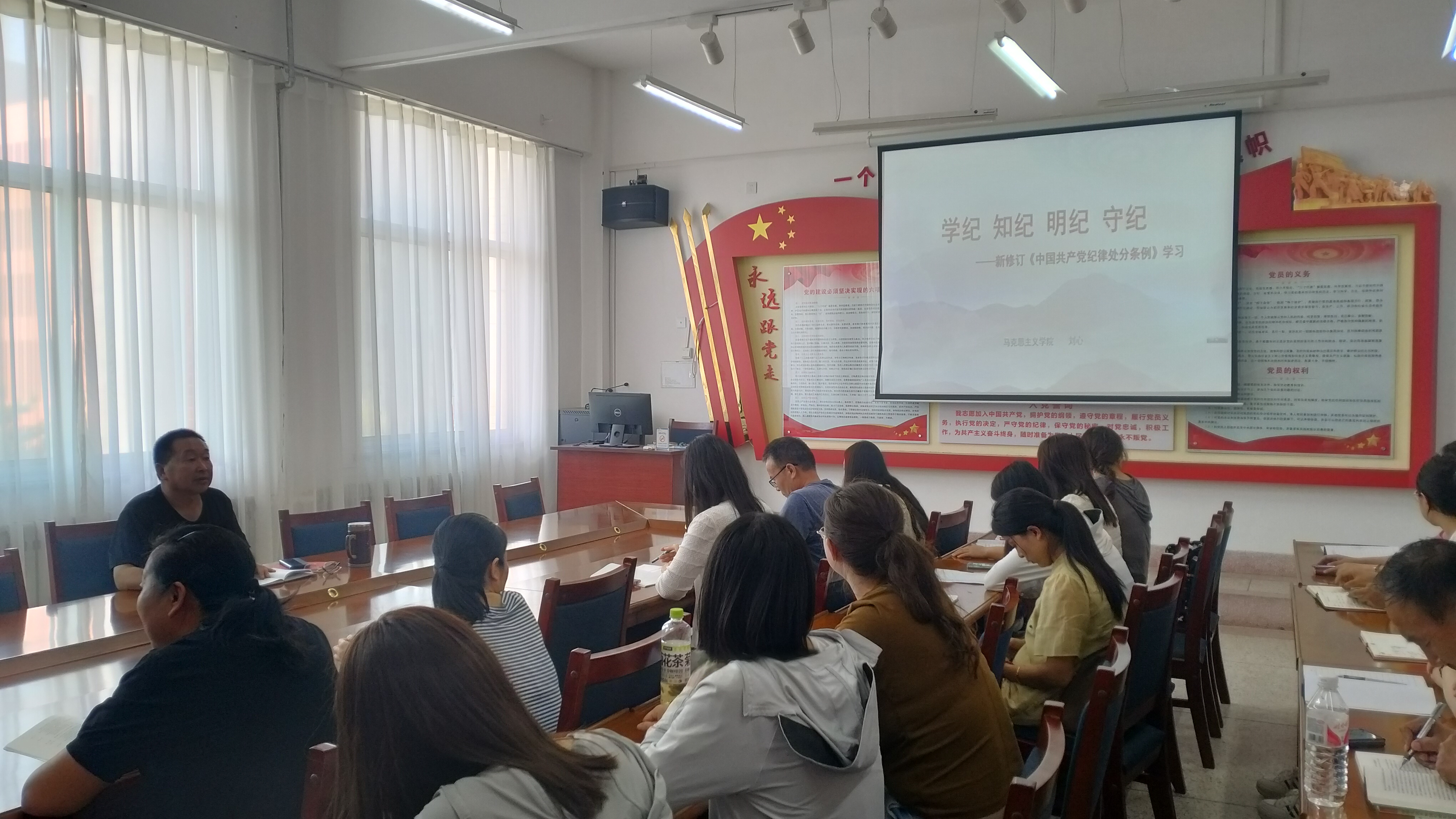 為扎實推進黨紀學(xué)習教育,進一步嚴明政治紀律和政治規(guī)矩,引導(dǎo)黨員教師真正做到學(xué)紀、知紀、明紀、守紀。5月21日,馬克思主義學(xué)院黨支部書記劉心作了黨紀學(xué)習教育專題輔導(dǎo),全體黨員參加。