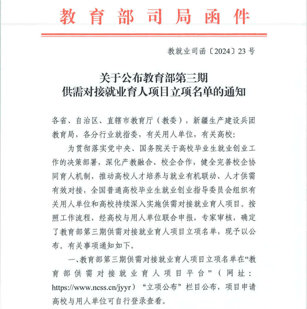 喜訊!學(xué)校獲批教育部第三期供需對(duì)接就業(yè)育人項(xiàng)目6項(xiàng)