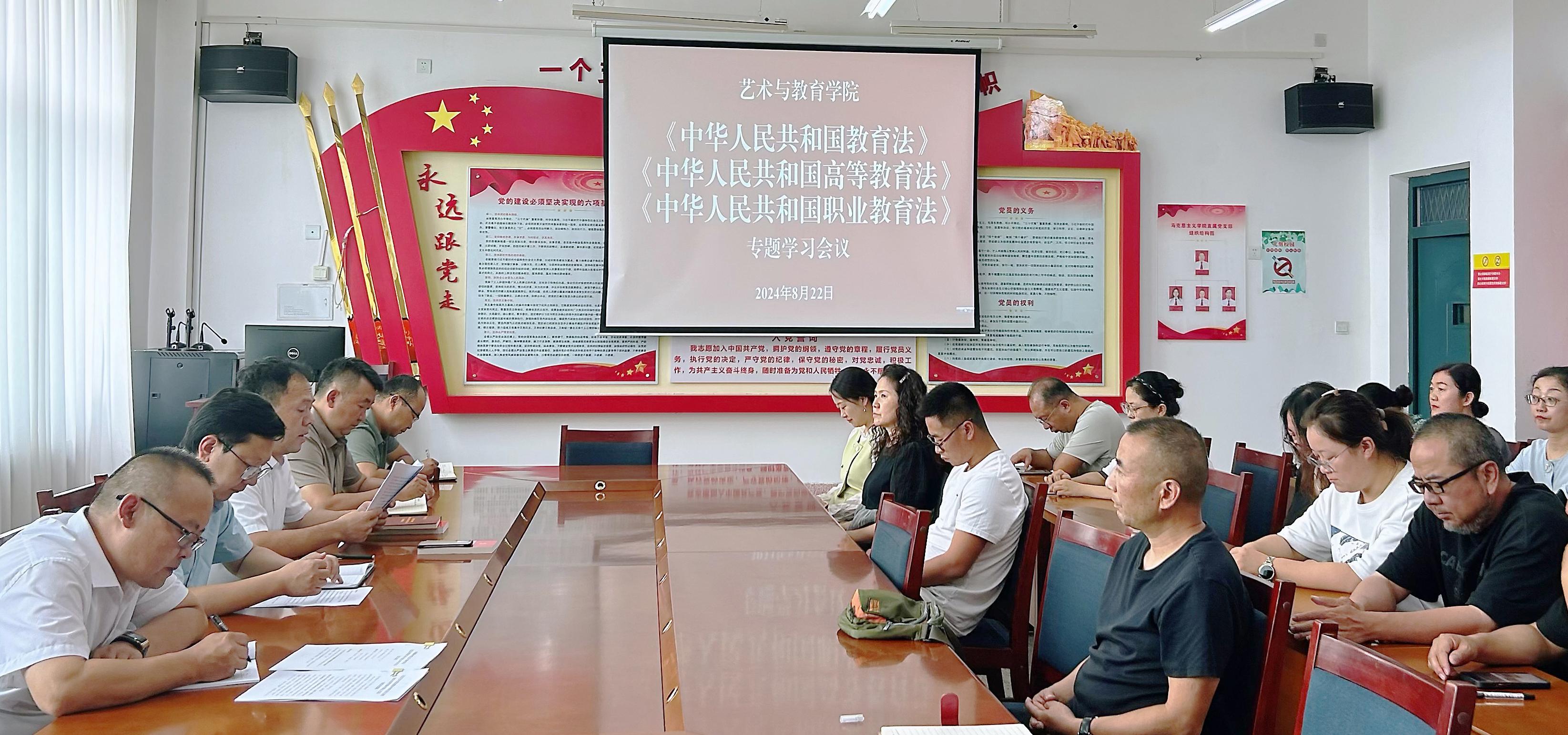 為進(jìn)一步提高教師的法律法規(guī)意識(shí),加強(qiáng)教師的師德師風(fēng)建設(shè),轉(zhuǎn)變觀念、解放思想,樹(shù)立現(xiàn)代職業(yè)教育觀念,扎實(shí)推動(dòng)教育教學(xué)工作高質(zhì)量發(fā)展,8月22日下午,藝術(shù)與教育學(xué)院組織全體教職工專(zhuān)題學(xué)習(xí)《中華人民共和國(guó)教育法》《中華人民共和國(guó)高等教育法》《中華人民共和國(guó)職業(yè)教育法》等教育相關(guān)法律法規(guī)及政策文件。會(huì)議由黨總支書(shū)記王政主持。