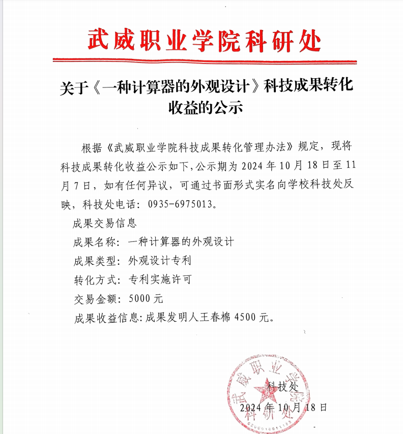 關(guān)于《一種計(jì)算器的外觀設(shè)計(jì)》科技成果轉(zhuǎn)化收益的公示