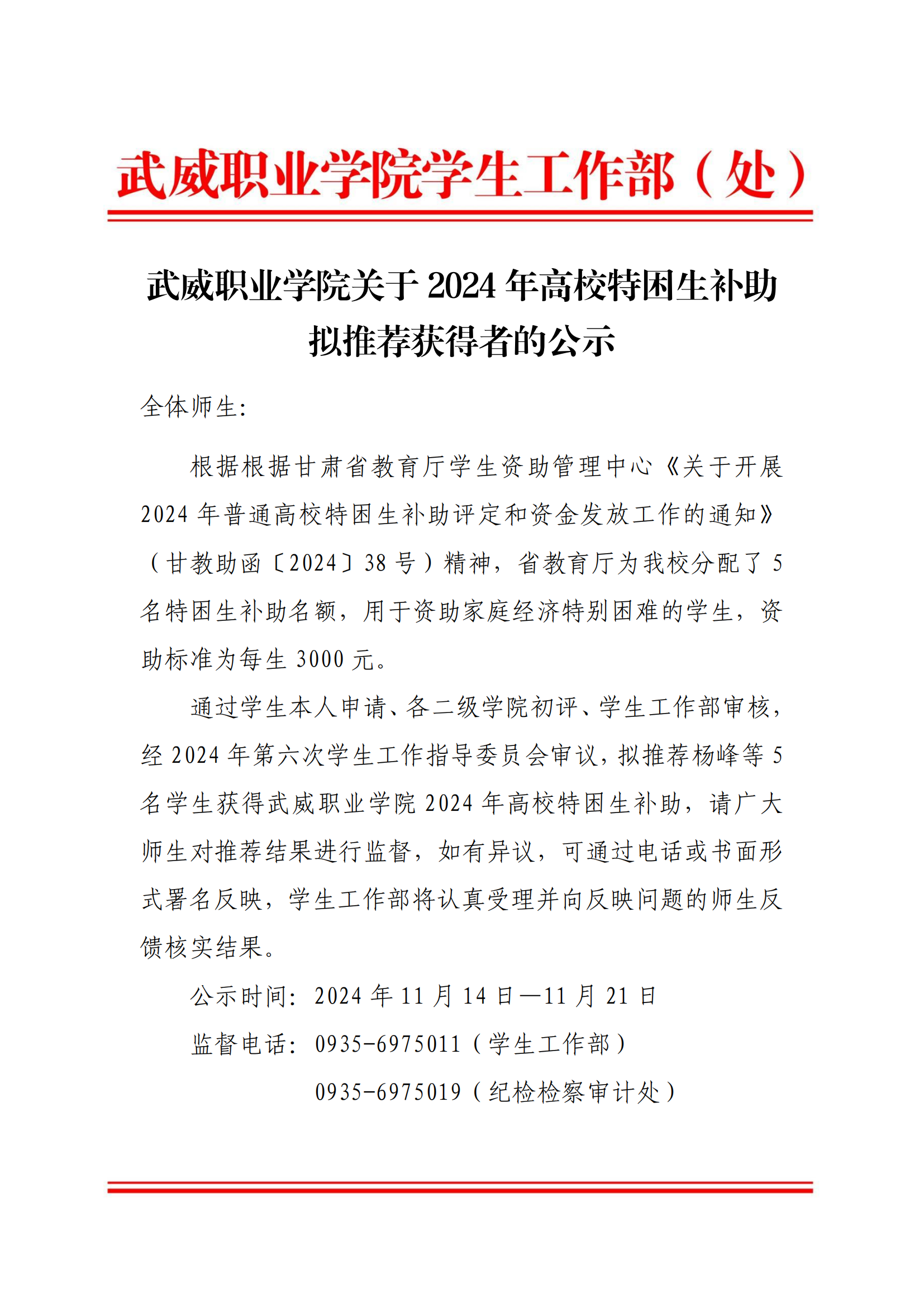 武威職業(yè)學(xué)院2024年高校特困生補(bǔ)助獲得者公示