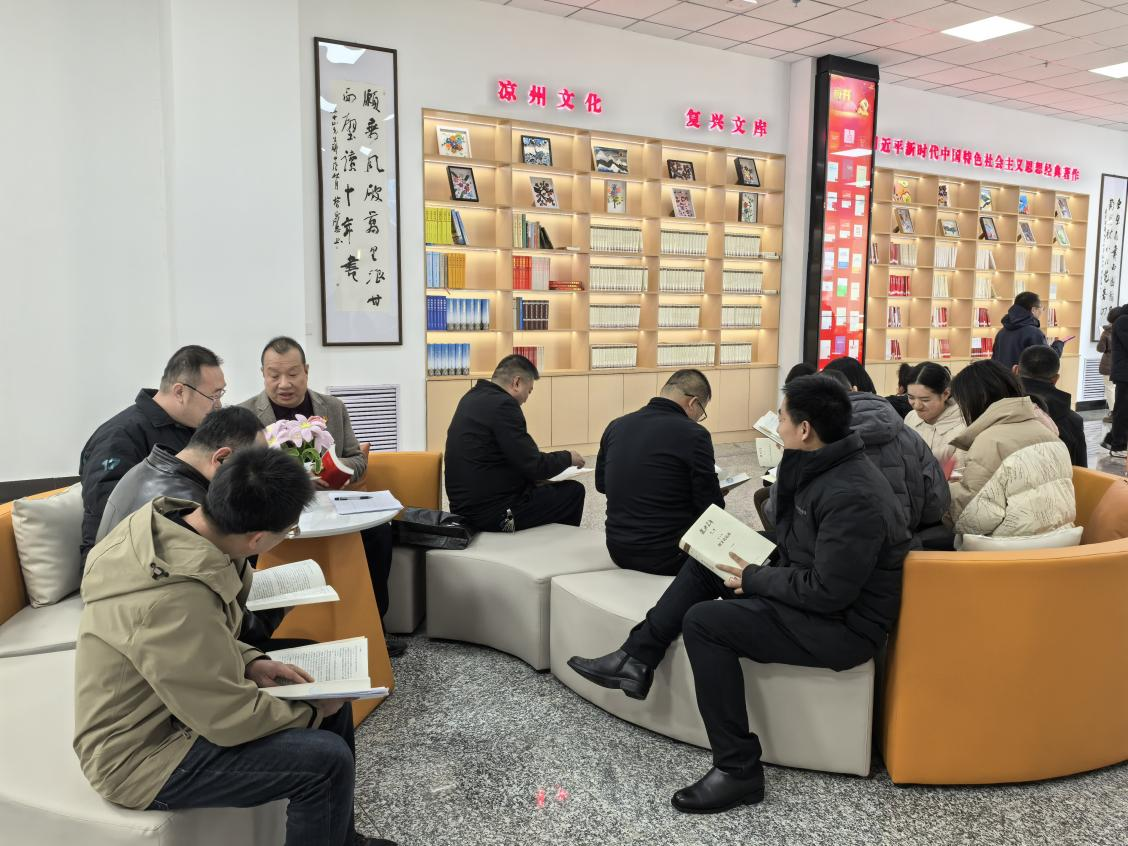 黨員們圍坐在書架旁,認(rèn)真閱讀關(guān)于習(xí)近平新時(shí)代中國特色社會(huì)主義思想書籍。書籍涵蓋了黨的創(chuàng)新理論、實(shí)踐探索、歷史經(jīng)驗(yàn)等多方面內(nèi)容。閱讀結(jié)束后,全體黨員在研討交流室集中觀看了視頻《中國共產(chǎn)黨人精神譜系》,并開展了研討。