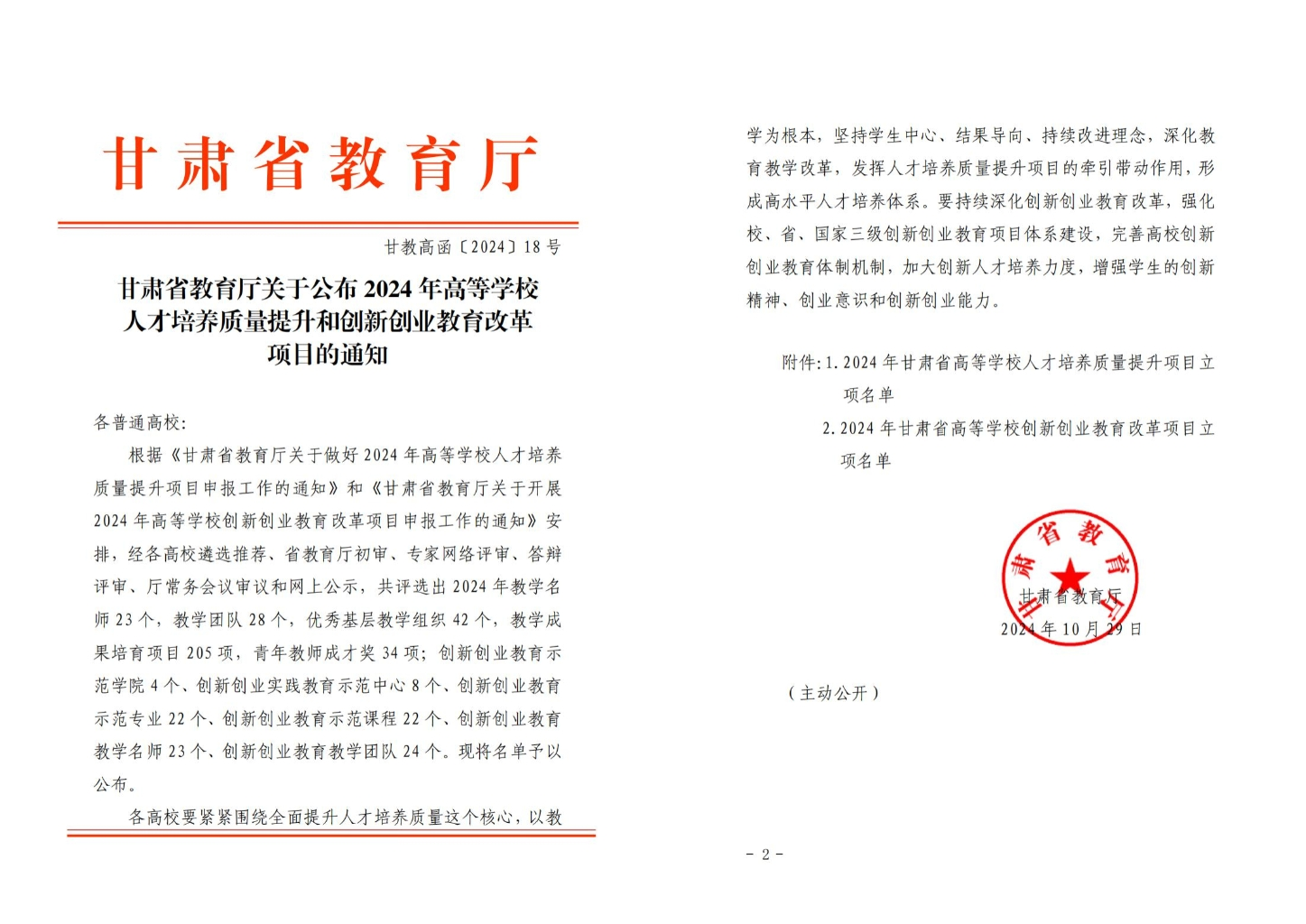 近日,甘肅省教育廳下發(fā)《關(guān)于公布2024年高等學(xué)校人才培養(yǎng)質(zhì)量提升和創(chuàng)新創(chuàng)業(yè)教育改革項(xiàng)目的通知》(甘教高函〔2024〕18 號(hào)),藥學(xué)院申報(bào)的藥學(xué)專業(yè)獲批創(chuàng)新創(chuàng)業(yè)教育示范專業(yè)。
