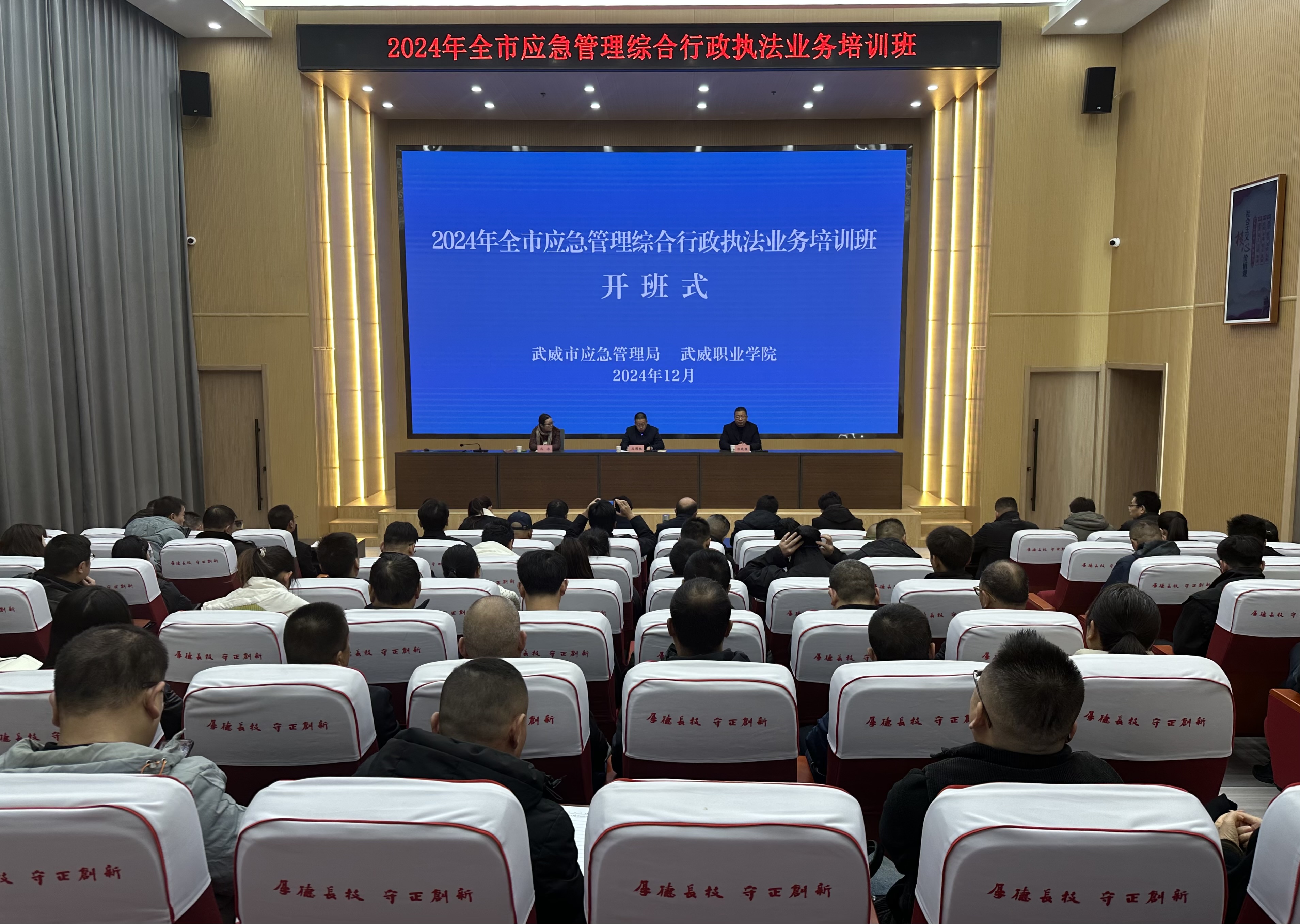 2024 年 12 月 3 日,由武威市應(yīng)急管理局主辦,我校承辦的“2024 年武威市應(yīng)急管理綜合行政執(zhí)法業(yè)務(wù)培訓(xùn)班暨安全監(jiān)管執(zhí)法競賽比武”正式開班。武威市應(yīng)急管理局黨組成員、副局長王國棟,學(xué)校黨委委員、紀委書記陳曉煜出席開班式。
