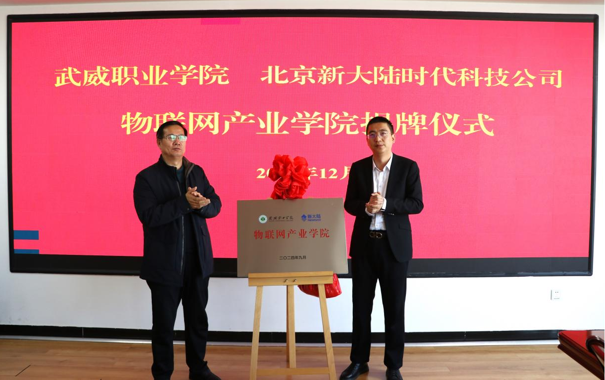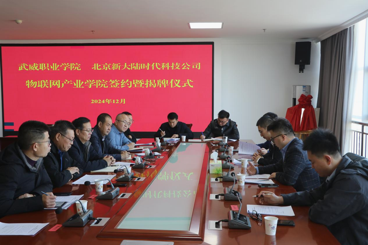為全面深化產(chǎn)教融合,加強(qiáng)校企合作,進(jìn)一步提高我校人才培養(yǎng)質(zhì)量。12月3日,學(xué)校在能源科技樓811會(huì)議室舉行武威職業(yè)學(xué)院和北京新大陸時(shí)代科技公司物聯(lián)網(wǎng)產(chǎn)業(yè)學(xué)院簽約暨揭牌儀式。北京新大陸時(shí)代科技公司西北區(qū)總監(jiān)劉寧、技術(shù)總監(jiān)樊斌,相關(guān)業(yè)務(wù)部門負(fù)責(zé)人,學(xué)校校長(zhǎng)、黨委副書(shū)記張開(kāi)禮、黨委副書(shū)記翟存祥、相關(guān)部門負(fù)責(zé)人及教師代表參加活動(dòng)。黨委委員、副校長(zhǎng)王永緒主持儀式。