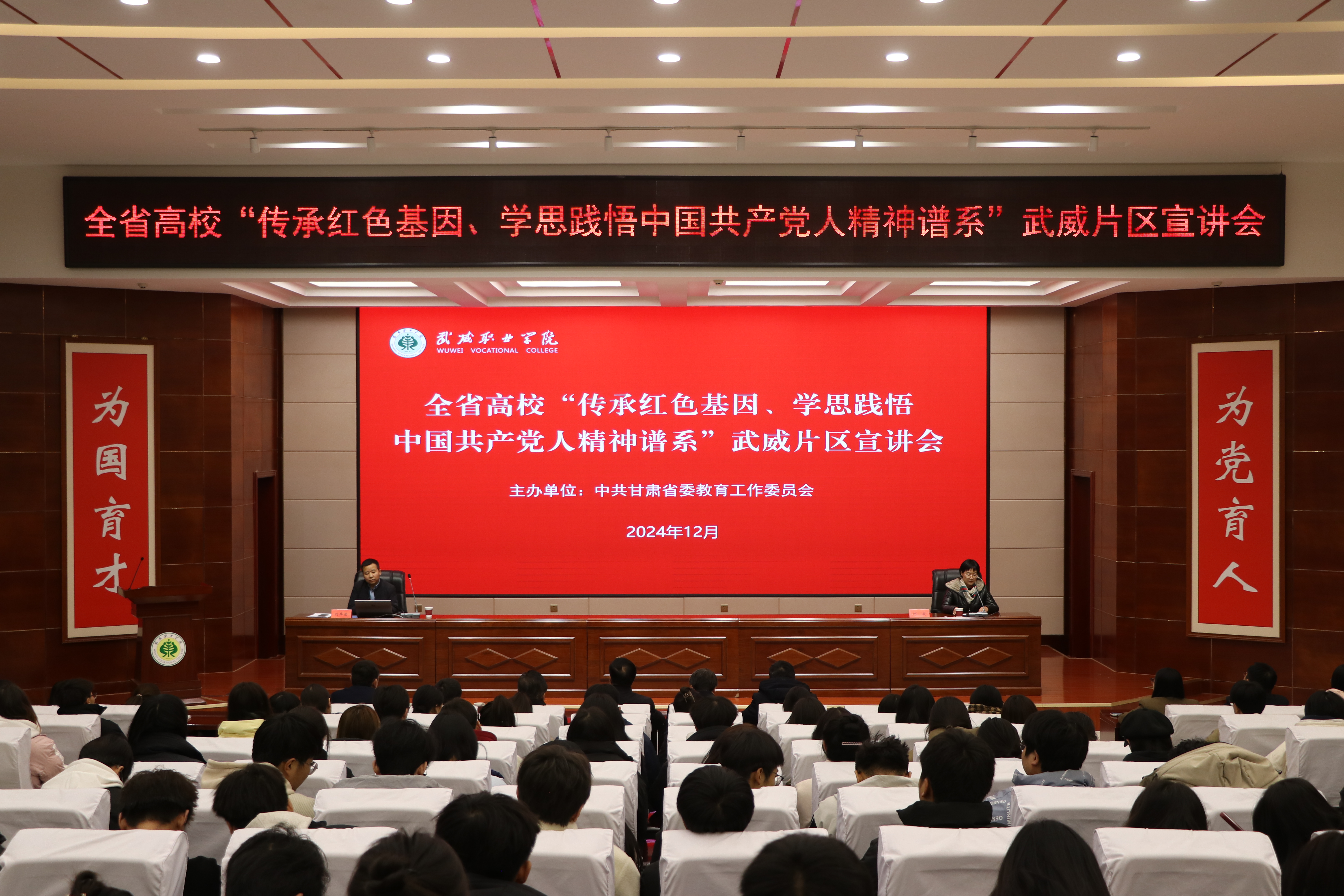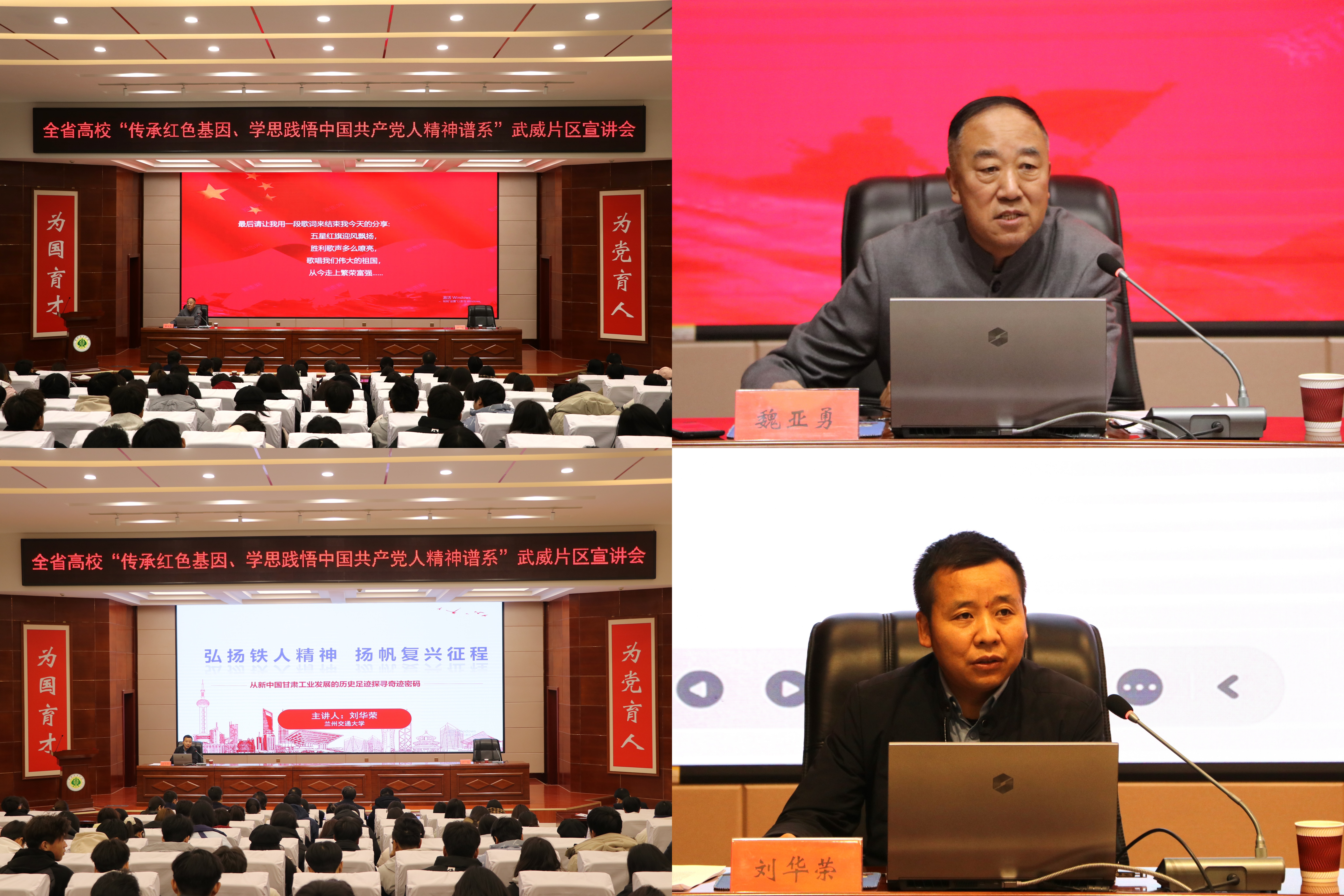 12月12日,由省委教育工委主辦,我校牽頭承辦的全省高?!皞鞒屑t色基因、學思踐悟中國共產黨人精神譜系”武威片區(qū)宣講會順利舉行。張掖市忠孝文化研習會會長魏亞勇、蘭州交通大學馬克思主義學院副院長劉華榮結合個人經歷,聚焦紅色文化、鐵人精神等開展示范宣講。甘肅畜牧工程職業(yè)技術學院和我校師生代表共計200人聆聽了宣講。宣講會由黨委委員、副校長何毅主持。