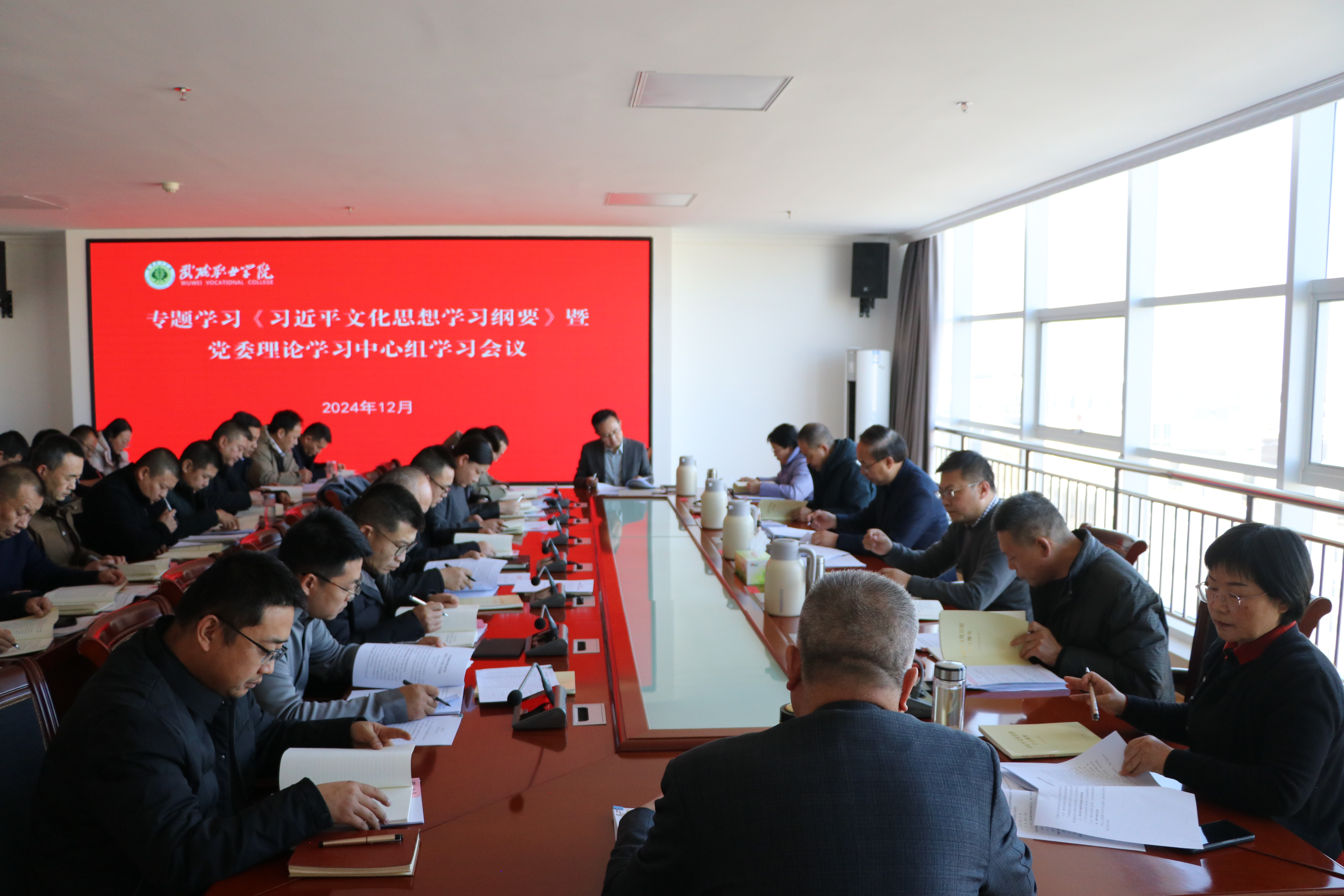 12月20日下午,學(xué)校召開《習(xí)近平文化思想學(xué)習(xí)綱要》專題學(xué)習(xí)暨黨委理論學(xué)習(xí)中心組學(xué)習(xí)會議。學(xué)校領(lǐng)導(dǎo),各部門、二級學(xué)院主要負責(zé)人,各黨總支與直屬黨支部書記參加會議。黨委書記王宏主持會議并講話。