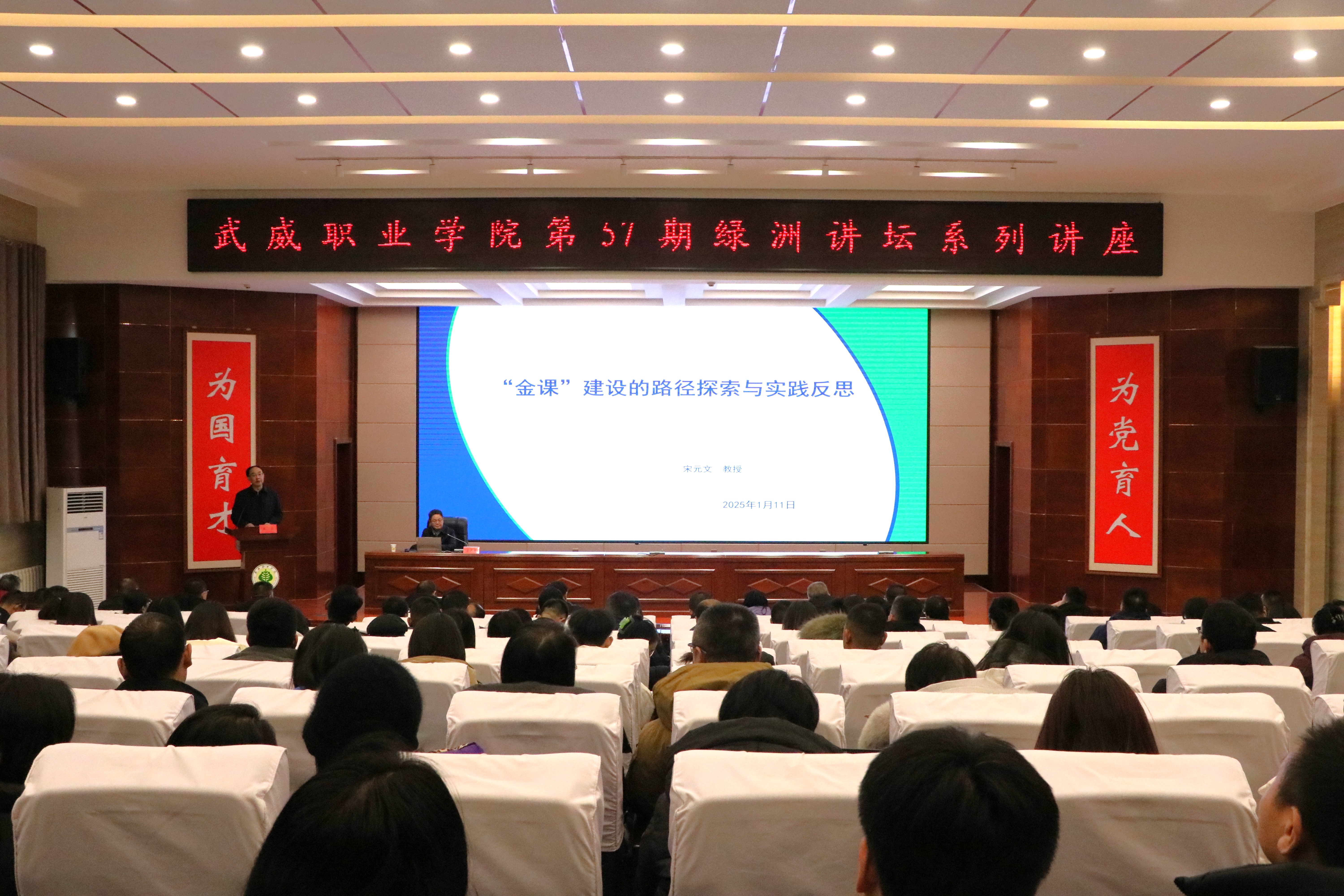 1月11日下午,學(xué)校特邀原蘭州資源環(huán)境職業(yè)技術(shù)大學(xué)副校長宋元文教授在菁英廳作了《“金課”建設(shè)的實(shí)踐反思與路徑探索》主題講座。講座由學(xué)校黨委書記王宏主持,學(xué)校領(lǐng)導(dǎo)、中層管理干部、教研室主任及教師代表共210余人參加。