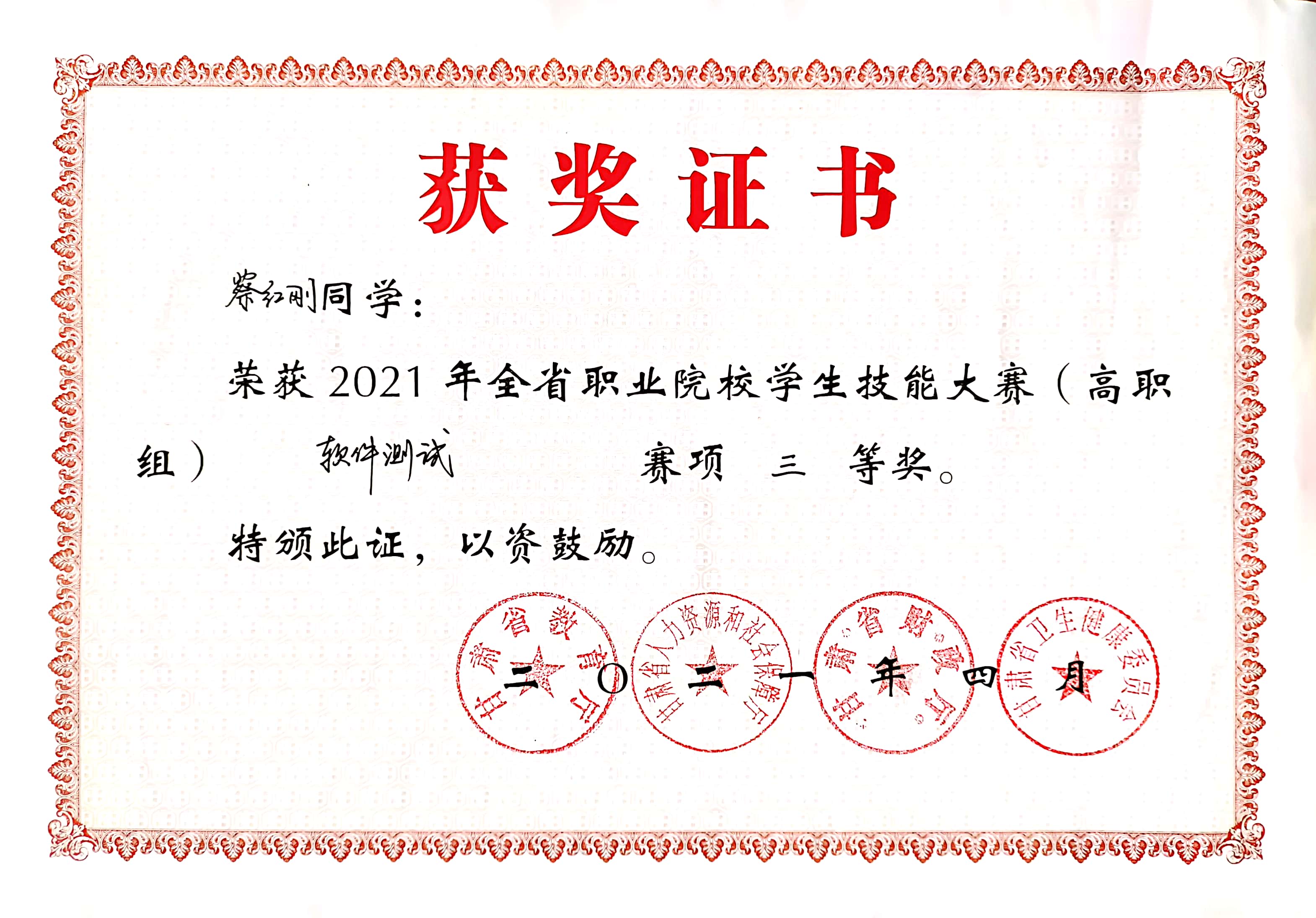 學(xué)生獲2021年全省職業(yè)院校學(xué)生技能大賽軟件測試三等獎