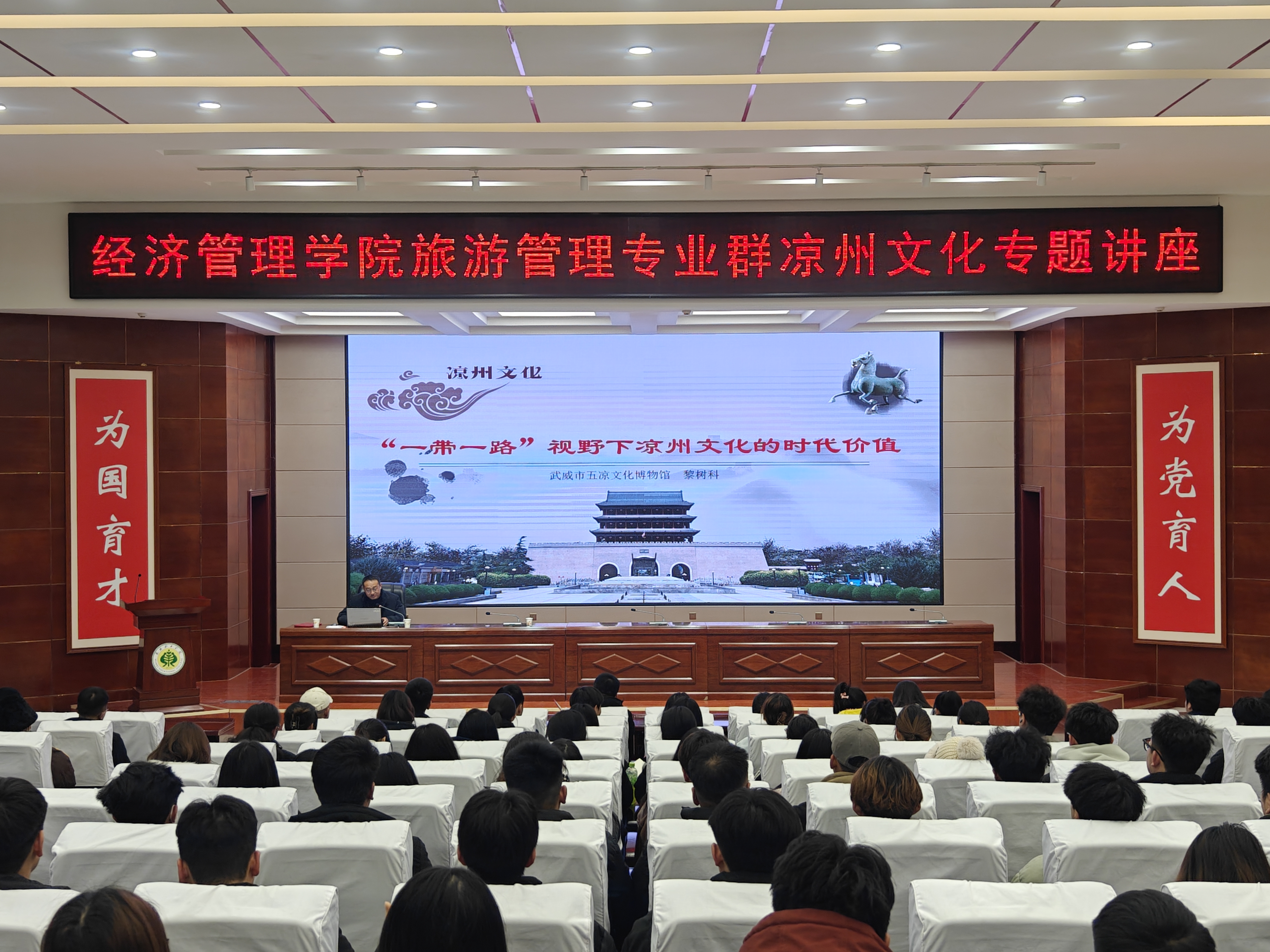 ? ? 12月11日下午,經(jīng)濟(jì)管理學(xué)院邀請武威市五涼文化博物館館長黎樹科開展了以《“一帶一路” 視野下涼州文化的時代價值》為主題的講座,旨在深入貫徹文化傳承發(fā)展戰(zhàn)略,加強(qiáng)傳統(tǒng)文化的弘揚與教育。學(xué)院近200名師生參加此次講座。
