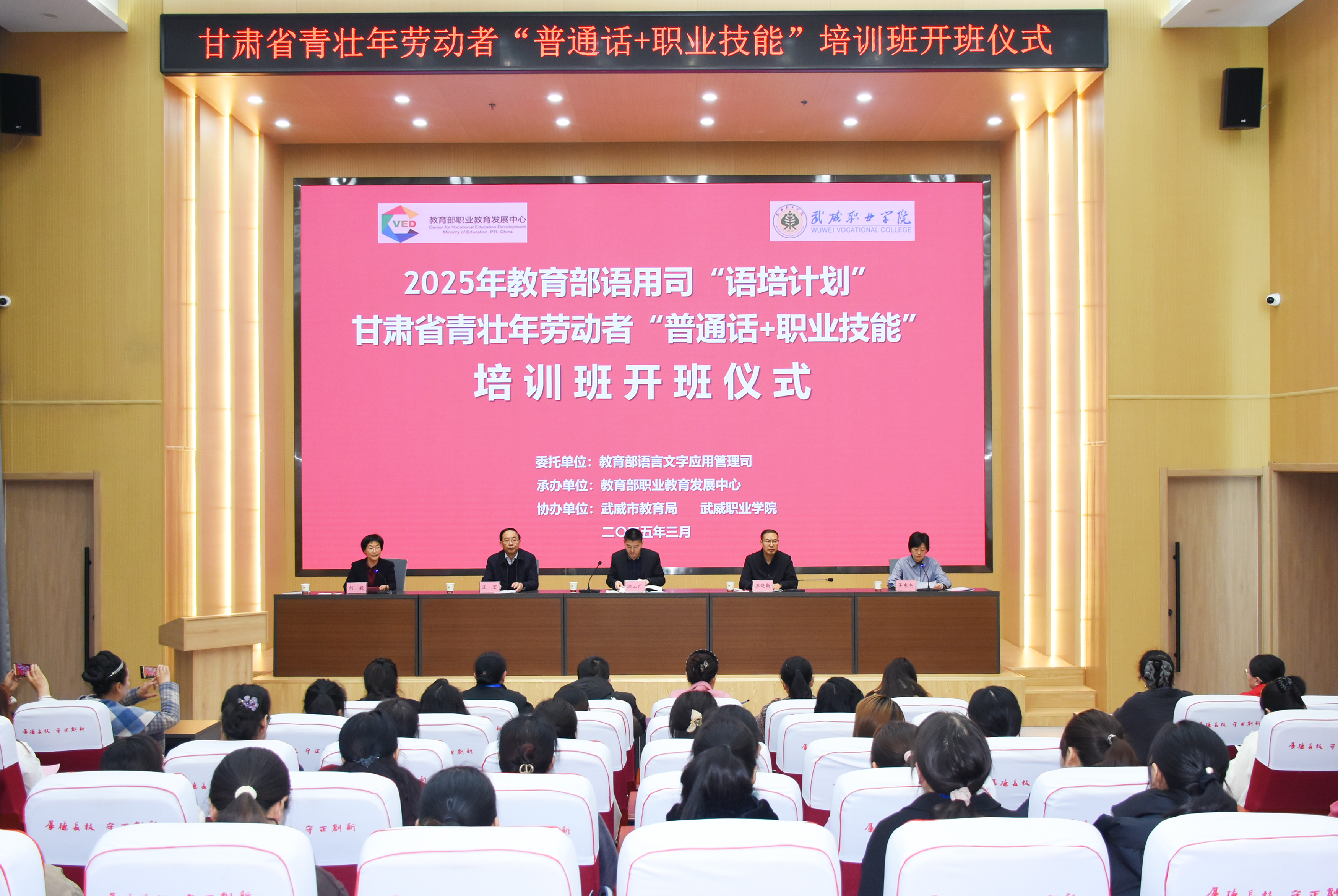 3月25日,教育部語(yǔ)用司“語(yǔ)培計(jì)劃”甘肅省青壯年勞動(dòng)者“普通話(huà)+職業(yè)技能”培訓(xùn)班在學(xué)校成功開(kāi)班。本次培訓(xùn)由教育部語(yǔ)用司主辦,教育部職業(yè)教育發(fā)展中心承辦,武威市教育局和學(xué)校協(xié)辦。本次培訓(xùn)是深入貫徹落實(shí)黨的二十大和二十屆二中、三中全會(huì)精神,落實(shí)全國(guó)教育大會(huì)精神,實(shí)施《教育強(qiáng)國(guó)建設(shè)規(guī)劃綱要(2024-2035年)》的重要舉措,旨在進(jìn)一步推廣國(guó)家通用語(yǔ)言文字的應(yīng)用,促進(jìn)鑄牢中華民族共同體意識(shí)。