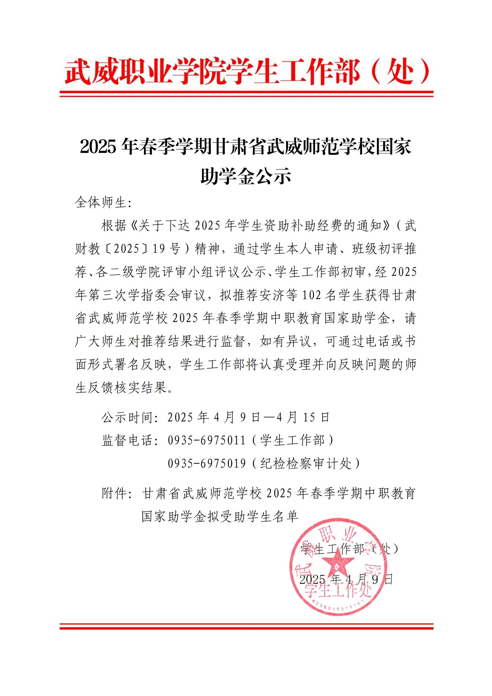 甘肅省武威師范學(xué)校關(guān)于2024-2025學(xué)年中職國家獎學(xué)金候選人的公示