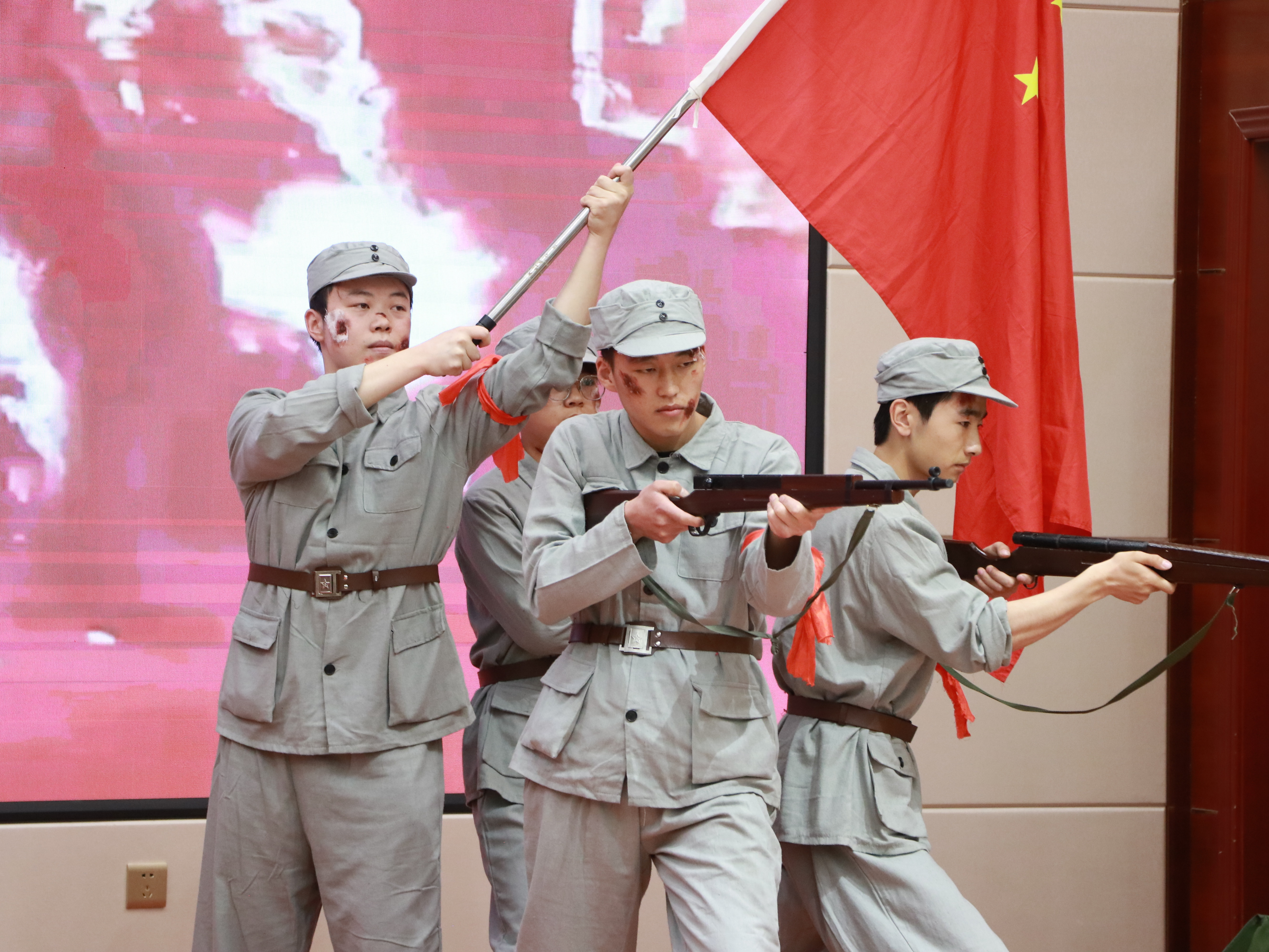 比賽現(xiàn)場(chǎng),各參賽隊(duì)伍以“誦、演、歌、頌”的復(fù)合表達(dá),帶領(lǐng)觀眾穿越歷史烽煙,重現(xiàn)那段氣壯山河的抗戰(zhàn)歲月。他們或慷慨激昂地講述革命先輩寧死不屈的壯舉,或手持泛黃家書(shū)深情誦讀,絕筆信中的母愛(ài)與家國(guó)大義在顫抖的聲線(xiàn)中重現(xiàn);或化身硝煙中的戰(zhàn)士,用染血繃帶與折斷鋼槍演繹出“十萬(wàn)青年十萬(wàn)軍”的悲壯群像。那些被歲月蝕刻的墨跡,此刻正在當(dāng)代青年的瞳孔里重新燃燒。一句句飽含深情的誦讀,一幕幕震撼人心的演繹,都傳遞著同學(xué)們對(duì)抗戰(zhàn)英烈的深切緬懷與崇高敬意?,F(xiàn)場(chǎng)掌聲如潮水般此起彼伏,經(jīng)久不息,激蕩著每一位觀眾的愛(ài)國(guó)情懷。