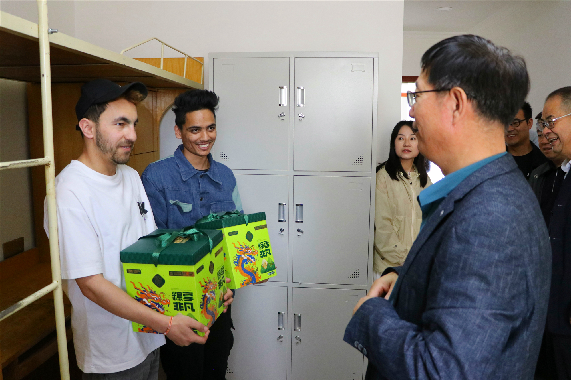 端午將至,為更好開展留學(xué)生教育管理工作,使我校來華留學(xué)生更好地認識和體驗中國傳統(tǒng)節(jié)日文化,5月30日,學(xué)校黨委副書記、副校長張開禮,黨委副書記翟存祥,黨委委員、副校長王守云一行與國際合作交流處全體工作人員走進留學(xué)生公寓,給留學(xué)生們送去節(jié)日的關(guān)懷和溫暖。
