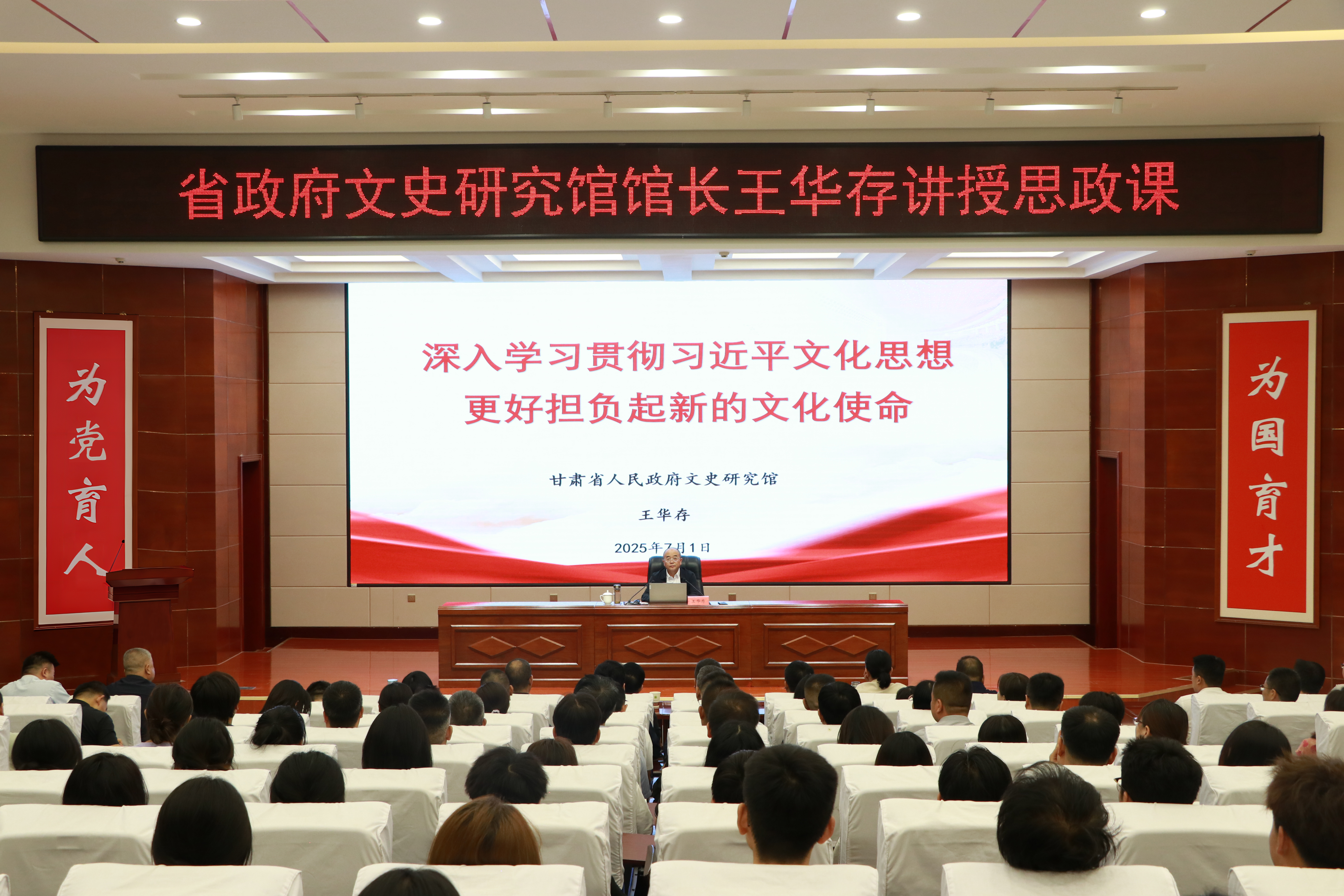 7月1日,在全校上下喜迎中國(guó)共產(chǎn)黨成立104周年之際,甘肅省人民政府文史研究館黨組書(shū)記、館長(zhǎng)王華存到學(xué)校為師生講授思想政治理論課。王華存以“深入學(xué)習(xí)貫徹習(xí)近平文化思想 更好擔(dān)負(fù)起新的文化使命”為題,從深刻認(rèn)識(shí)習(xí)近平文化思想的形成過(guò)程、習(xí)近平文化思想的豐富內(nèi)涵和核心要義、甘肅文化歷史簡(jiǎn)述、當(dāng)代青年如何更好擔(dān)當(dāng)起新的文化使命四個(gè)方面對(duì)習(xí)近平文化思想進(jìn)行了全面解讀。黨委書(shū)記王宏主持,學(xué)校領(lǐng)導(dǎo)、中層管理干部及師生代表共200余人到場(chǎng)聆聽(tīng)。