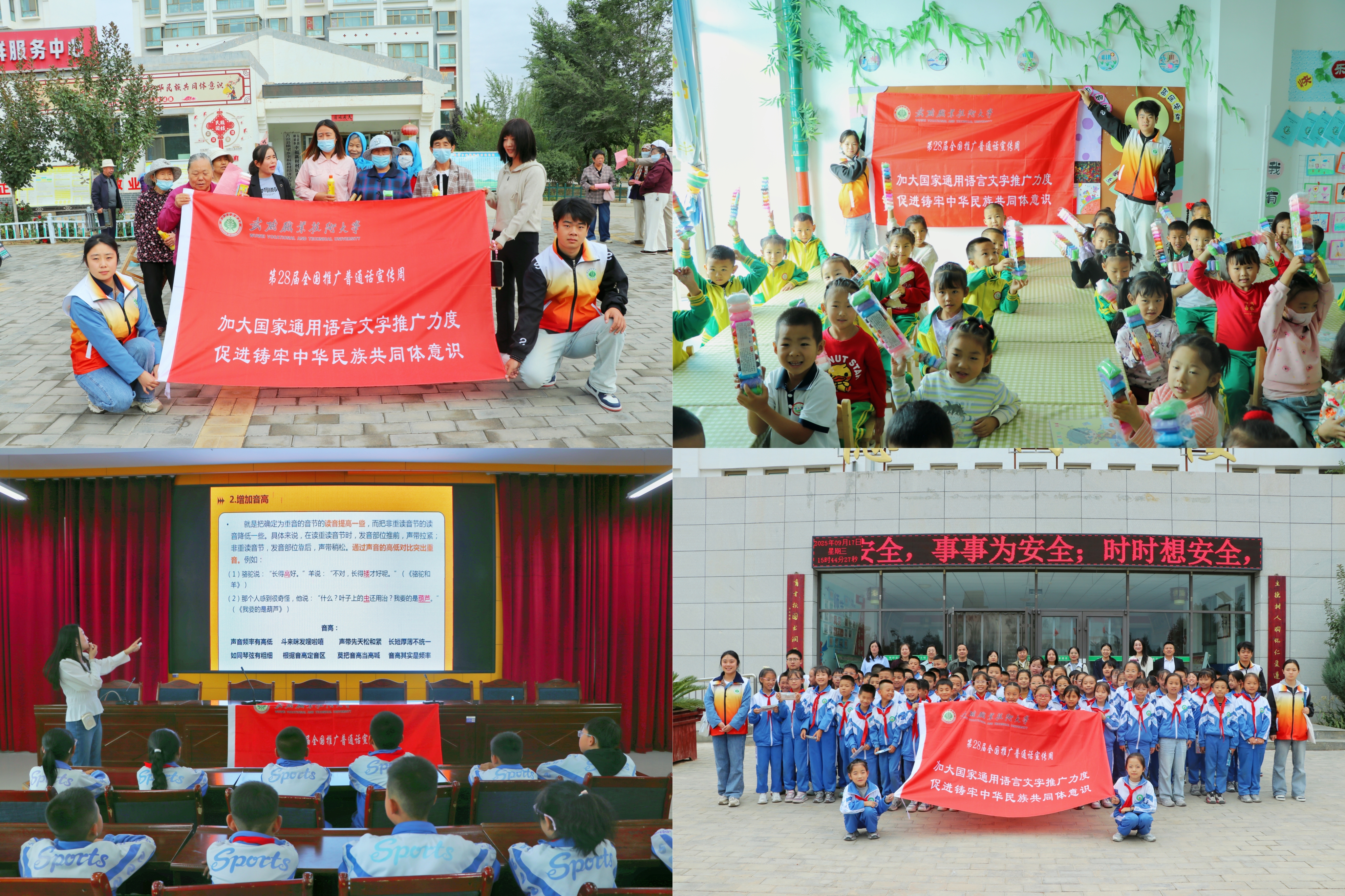 9月17日,武威職業(yè)技術(shù)大學(xué)推普志愿服務(wù)隊(duì)一行赴古浪縣綠洲小鎮(zhèn)幸福新村、康寧新村、綠洲完全小學(xué)及綠洲幼兒園,開展以“加大國家通用語言文字推廣力度,促進(jìn)鑄牢中華民族共同體意識”為主題的國家通用語言文字推廣活動,以實(shí)際行動助力鄉(xiāng)村振興。