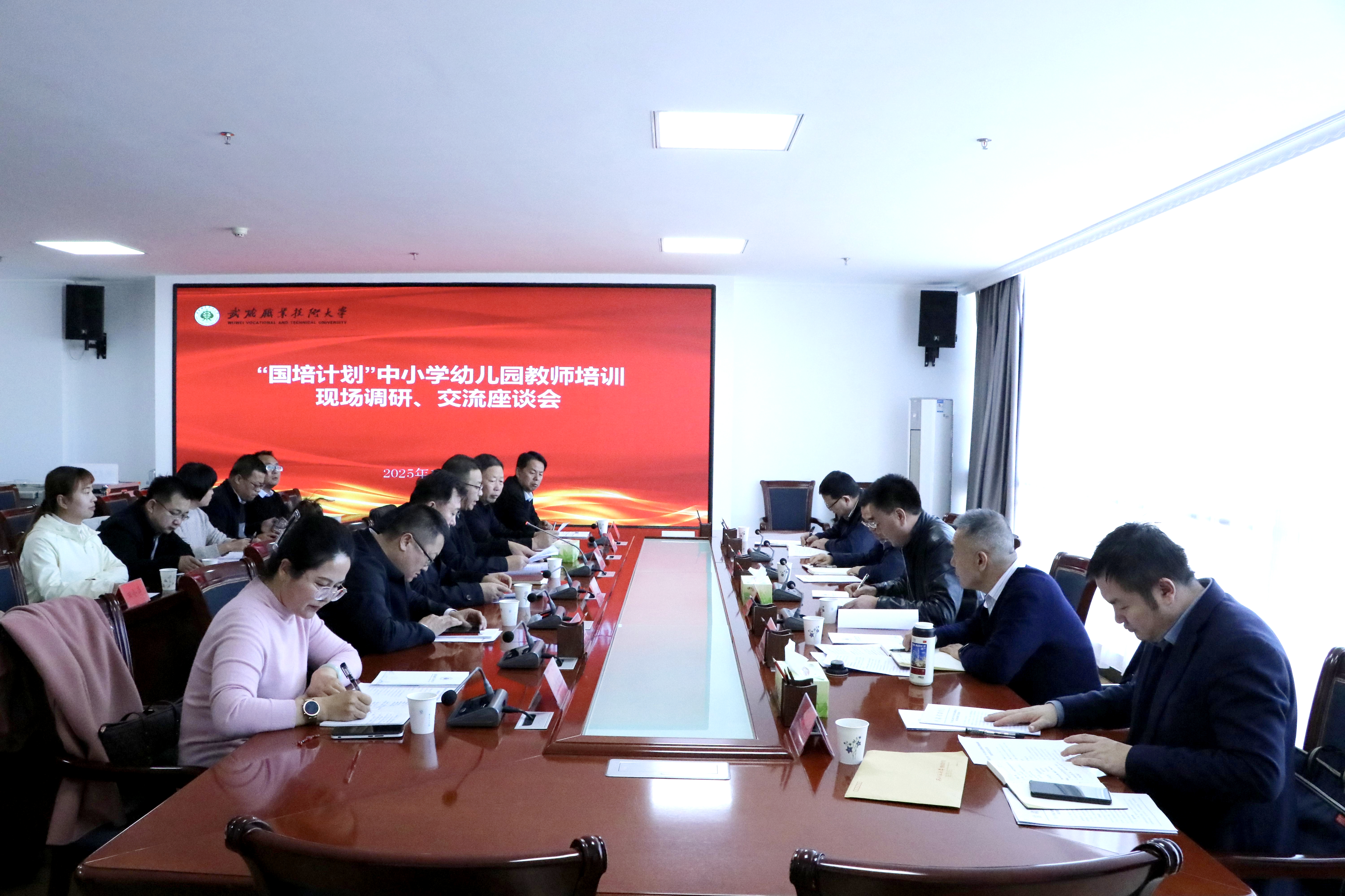 11月14日,2025“國培計劃”中小學幼兒園教師培訓現(xiàn)場調(diào)研交流座談會在學校能源科技樓811會議室順利召開。座談會特邀西北師范大學繼續(xù)教育學院院長趙輝、甘肅省教師發(fā)展中心常務(wù)副主任王文槐、教育部“國培計劃”專家資源庫專家沈建洲、西北師范大學財務(wù)處副處長劉紀良、甘肅省教師發(fā)展中心干部趙彬彬等組成視導專家組,與武威市教育局領(lǐng)導、一線授課教師代表、跟崗研學學校代表及參訓學員代表齊聚一堂,圍繞教師培訓項目實施情況展開深度交流與指導。黨委委員、紀委書記、監(jiān)察專員陳曉煜主持會議。