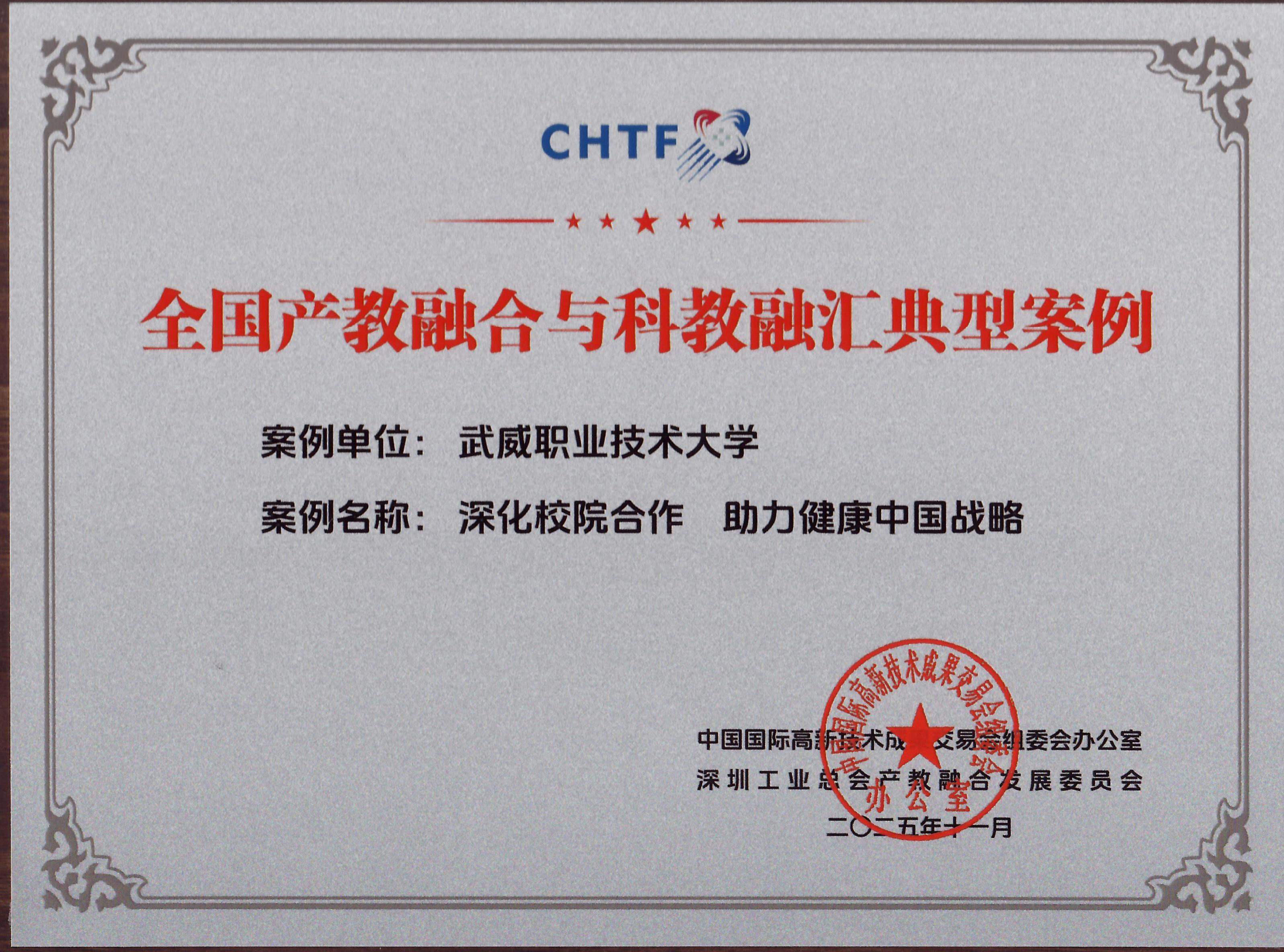 近日,第二十七屆中國國際高新技術(shù)成果交易會組委會公布產(chǎn)教融合與科教融匯典型案例評選結(jié)果,我校報送的《深化校院合作 助力健康中國戰(zhàn)略——武威職業(yè)技術(shù)大學(xué)與甘肅省武威腫瘤醫(yī)院開展校院合作新實踐》成功入選《全國產(chǎn)教融合與科教融匯典型案例匯編》,標志著我校在實施科教融匯行動,推動健康人才培養(yǎng)實踐獲得國家級平臺認可。