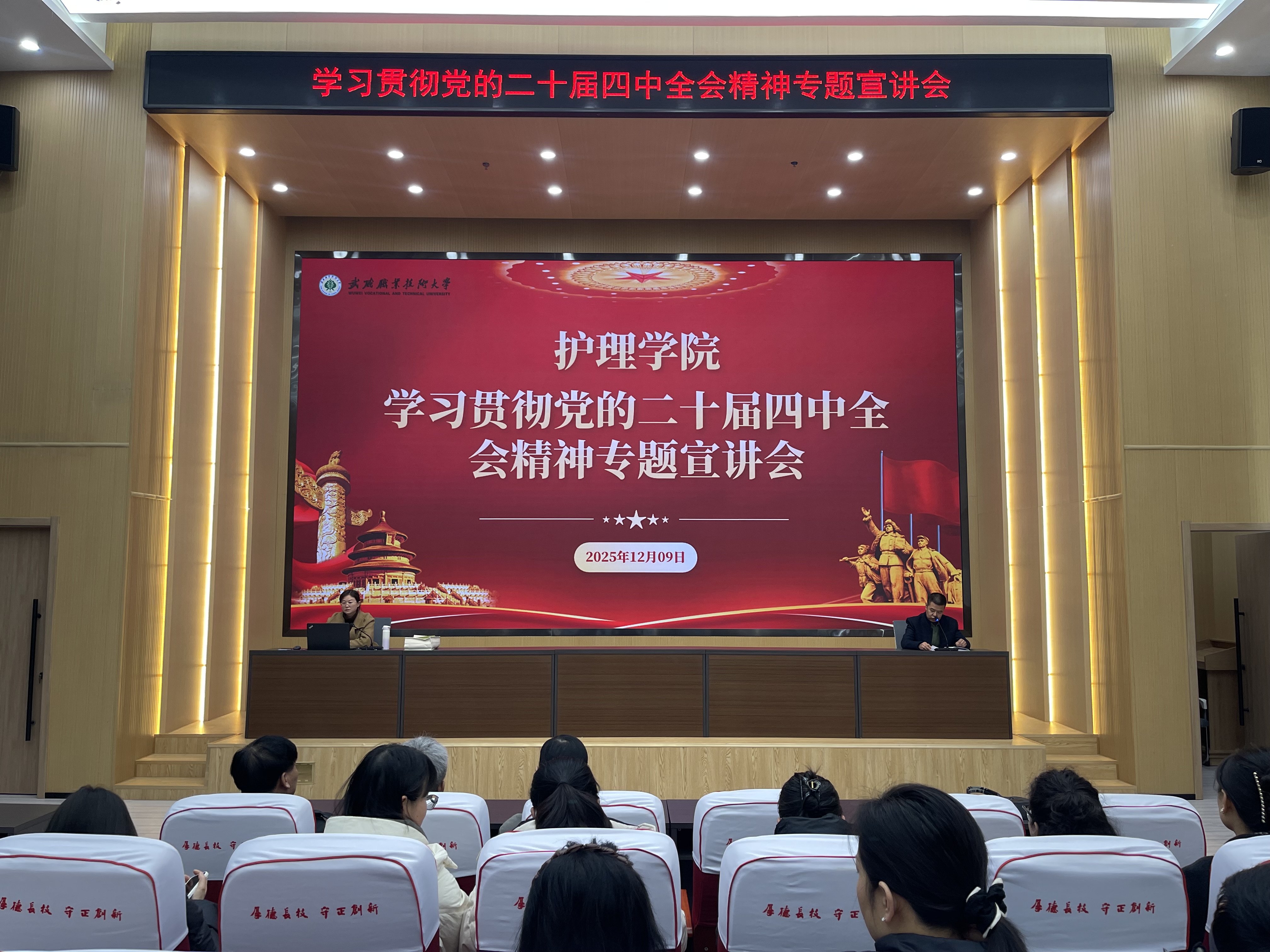 為深入學(xué)習(xí)宣傳貫徹黨的二十屆四中全會(huì)精神,切實(shí)把思想和行動(dòng)統(tǒng)一到黨中央決策部署上來,根據(jù)學(xué)校黨委統(tǒng)一安排,12月9日,護(hù)理學(xué)院舉行了學(xué)習(xí)宣傳貫徹黨的二十屆四中全會(huì)精神專題宣講報(bào)告會(huì)。學(xué)校宣講組成員、馬克思主義學(xué)院教師杜曉娟應(yīng)邀做專題宣講。學(xué)院領(lǐng)導(dǎo)班子、全體教職工、預(yù)備黨員、入黨積極分子及班團(tuán)干部共計(jì)100余人聆聽了報(bào)告會(huì)。報(bào)告會(huì)由學(xué)院黨總支書記藺生武主持。