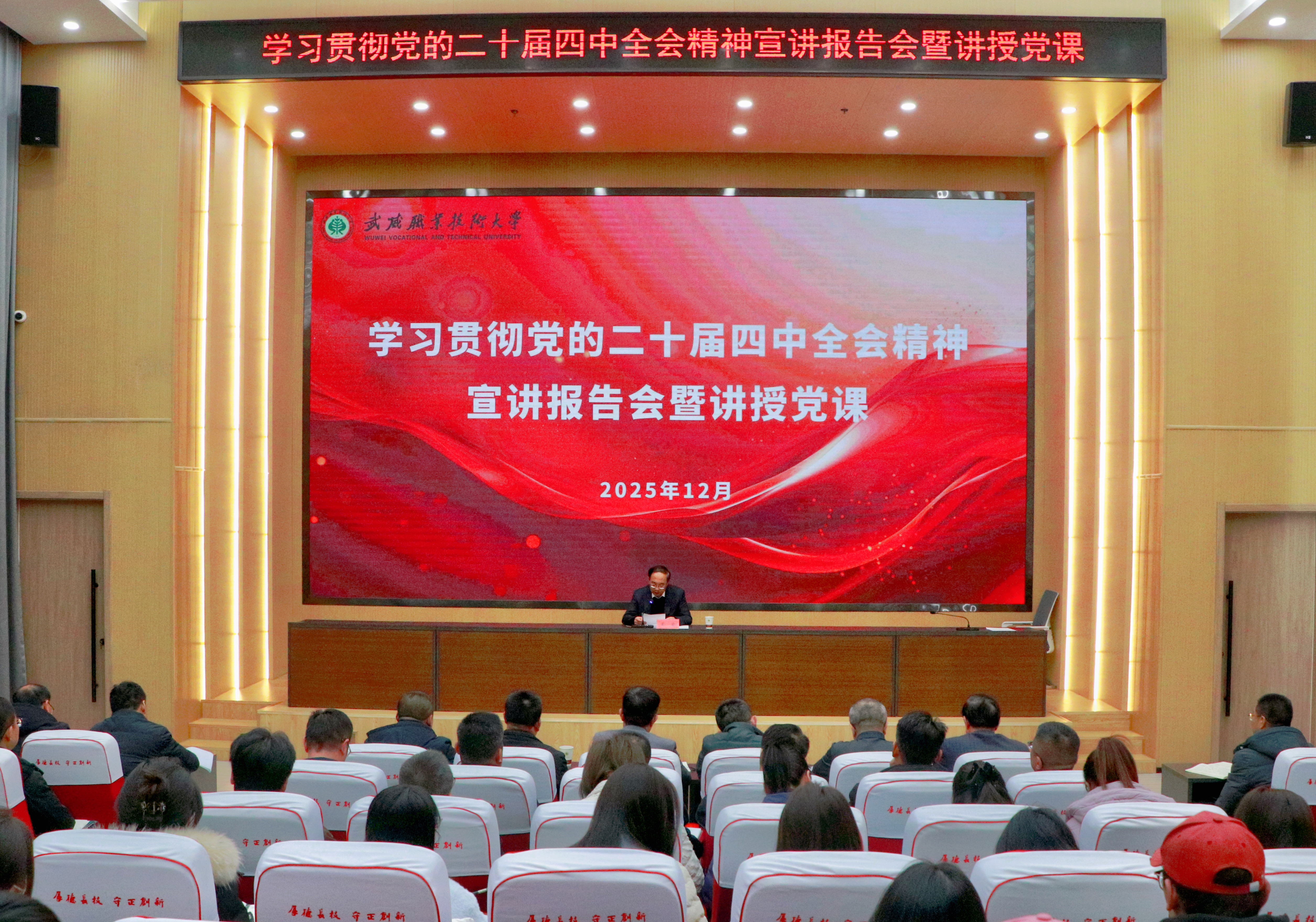 12月10日,黨委書(shū)記王宏專(zhuān)題宣講黨的二十屆四中全會(huì)精神,并向師生講授黨課。他強(qiáng)調(diào),要深入學(xué)習(xí)貫徹黨的二十屆四中全會(huì)精神,全面把握核心要義,立足職業(yè)本科教育新起點(diǎn),奮力譜寫(xiě)學(xué)校高質(zhì)量發(fā)展新篇章,為加快推進(jìn)中國(guó)式現(xiàn)代化武威實(shí)踐貢獻(xiàn)智慧力量。黨委副書(shū)記、副校長(zhǎng)張開(kāi)禮主持報(bào)告會(huì)。