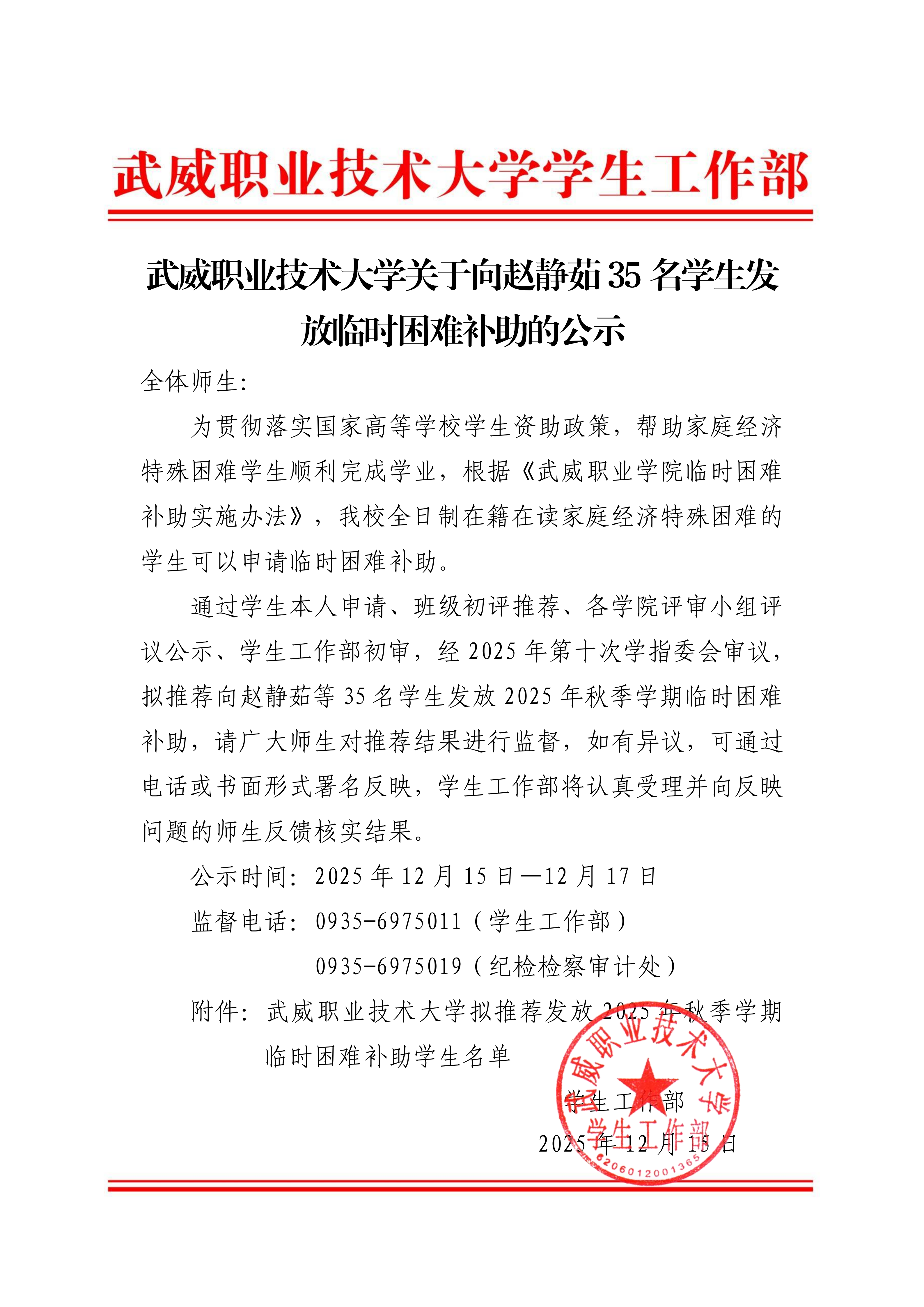 武威職業(yè)技術大學關于向趙靜茹35名學生發(fā)放臨時困難補助的公示