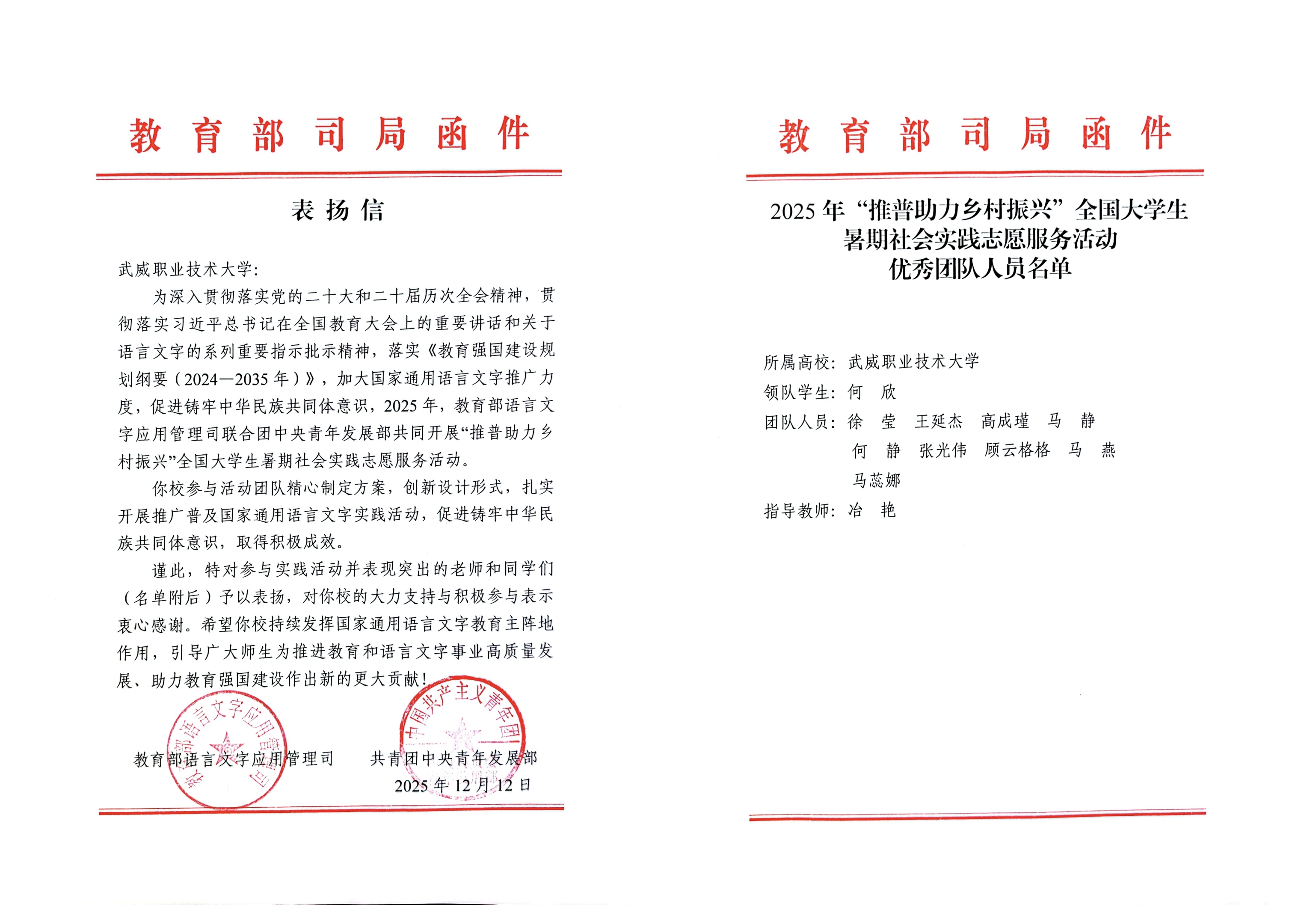 喜報!武威職業(yè)技術(shù)大學(xué)“推普助力·鄉(xiāng)村振興”暑期社會實踐團隊獲評全國優(yōu)秀團隊