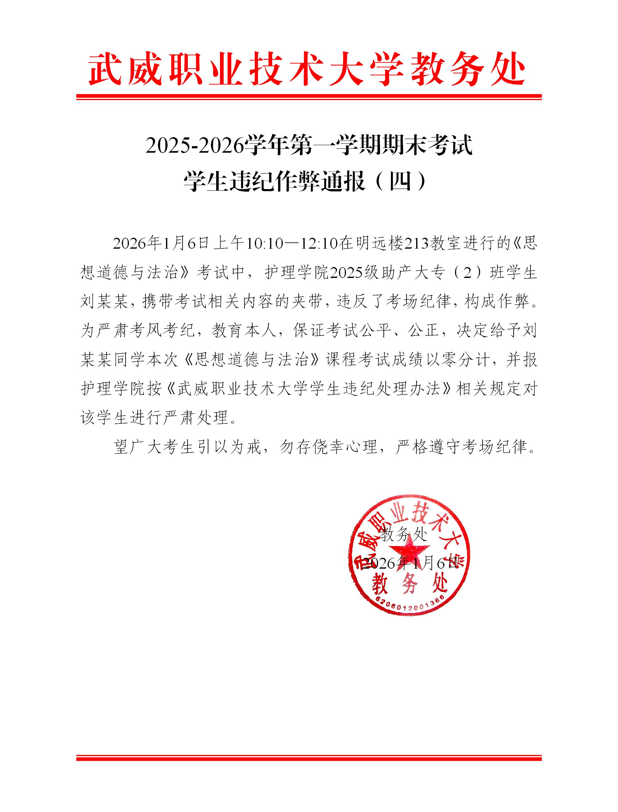2025-2026學(xué)年第一學(xué)期期末考試學(xué)生違紀(jì)作弊通報(bào)(四)