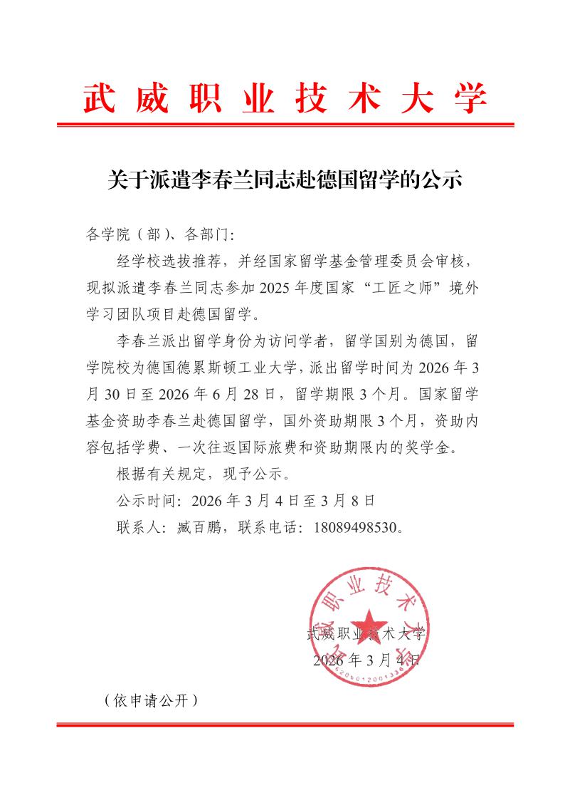 關(guān)于派遣李春蘭同志赴德國留學(xué)的公示