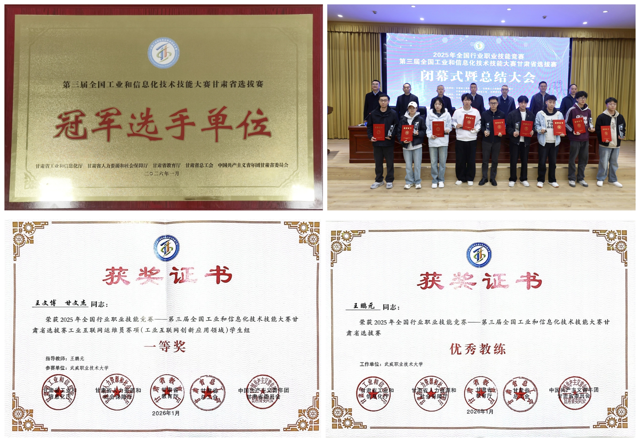 近日,2025年全國行業(yè)職業(yè)技能競賽——第三屆全國工業(yè)和信息化技術技能大賽甘肅省選拔賽在甘肅工業(yè)職業(yè)技術大學順利閉幕。我校信息技術學院參賽選手王文博、甘文杰憑借其扎實的專業(yè)基礎、精湛的操作技藝與穩(wěn)健的臨場表現(xiàn),在激烈競爭中脫穎而出,榮獲大賽一等獎,我校被授予“冠軍選手單位”榮譽稱號。