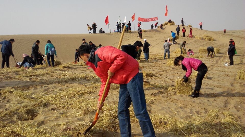 早上9點(diǎn),志愿者們在武威市青年志愿者協(xié)會(huì)的帶領(lǐng)下參觀了民勤防沙治沙展覽館,了解了勤勞的民勤人民在防沙治沙的歷程中付出的艱辛和取得的成果。隨后,志愿者們到達(dá)了民勤縣薛百鄉(xiāng)黃篙井的壓沙現(xiàn)場,按照劃分好的區(qū)域,在專業(yè)技術(shù)人員指導(dǎo)下,志愿者們鋪草壓沙,勞動(dòng)場面分工明確,井然有序。經(jīng)過一天的辛勤勞動(dòng),50余畝沙丘變成了棋格般整齊的沙障,堅(jiān)實(shí)的沙障阻止了沙丘的移動(dòng),為明春造林活動(dòng)打好了基礎(chǔ)。