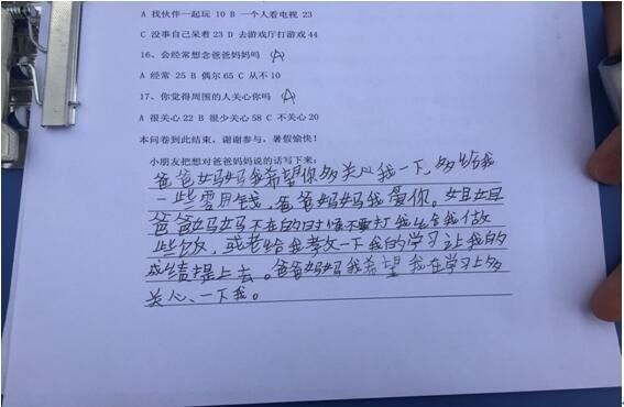 最后志愿者們坐下來相互探討提出建議:父母努力承擔孩子的教育責任。父母雖在外,但是還是應(yīng)該采取多種方式,多與孩子的溝通交流,以了解孩子的生活、學習、情感變化,比如多用電話聯(lián)系。父母是孩子的第一任老師,因此父母的教育是對孩子影響最大的,因此父母應(yīng)該多關(guān)心孩子,如果不能?;丶?,則應(yīng)該向孩子的老師說明自己的情況,了解子女的發(fā)展變化,以共同商討教育孩子的策略和方法。同時也要加強關(guān)愛留守兒童的各類社會宣傳。充分發(fā)揮各媒體的作用,使更多的人加入到對留守兒童教育問題的研究中來,使各界各類人士共同來探討和研究,從而使留守兒童教育問題得到切實的解決。