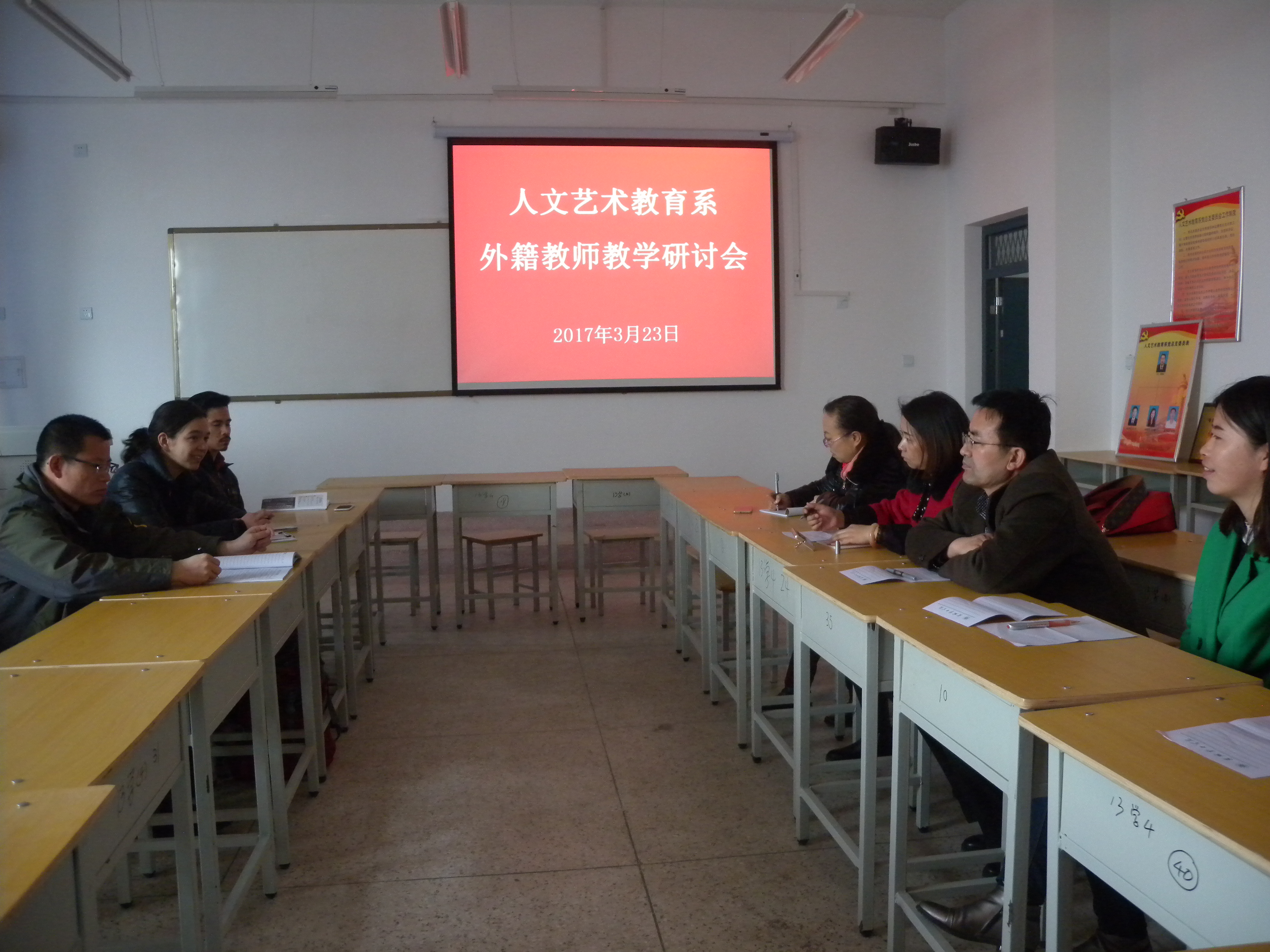 3月23日下午,人文藝術教育系在勵勤樓403教室召開了外籍教師教學研討會。會議由文英教研室主任趙金存老師主持,文英教研室全體英語老師、美中友好志愿者志愿教師MARIA(羅曼麗)和JUSTIN(王杰)及美中友好志愿者志管理人員臧百鵬老師參加了會議。