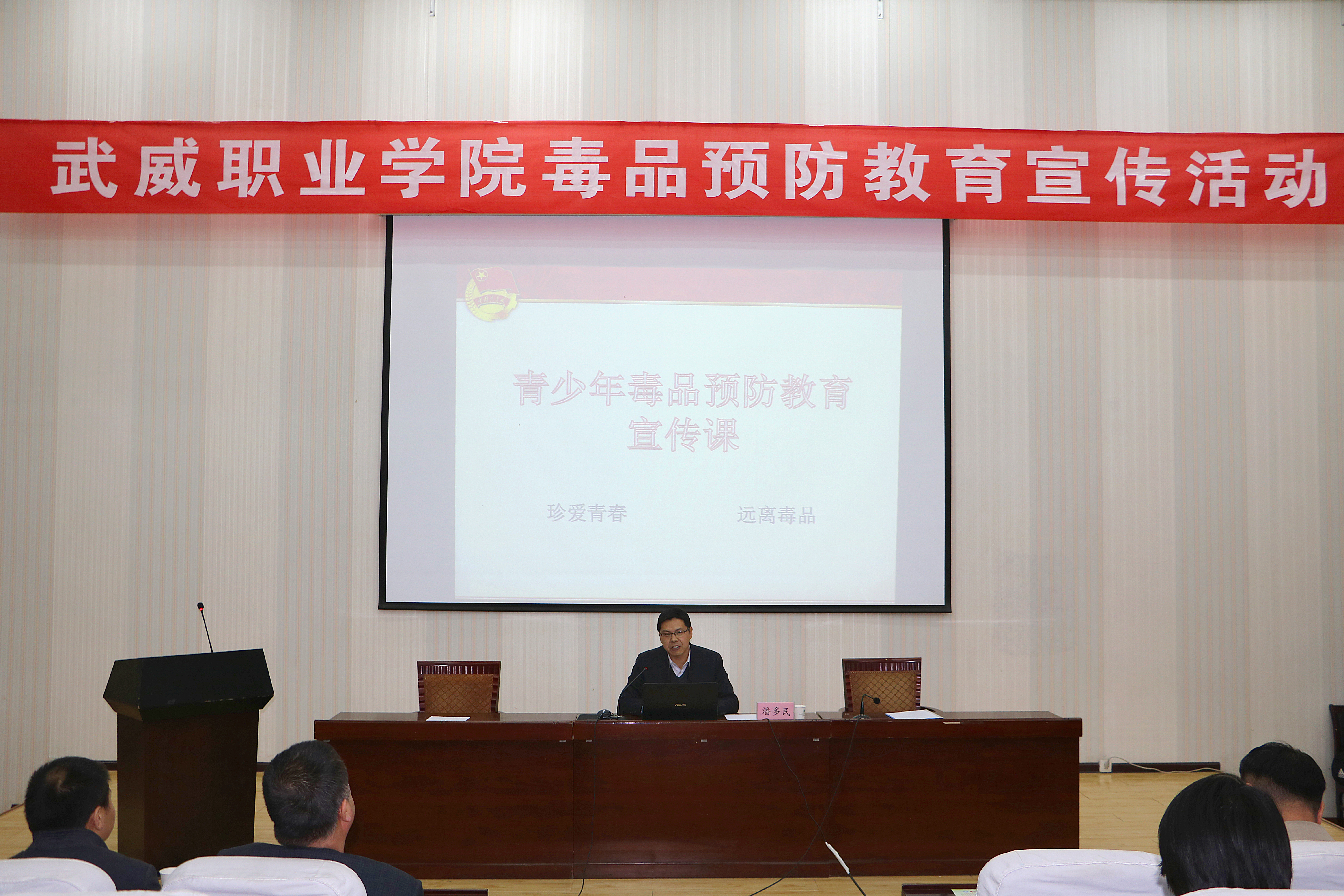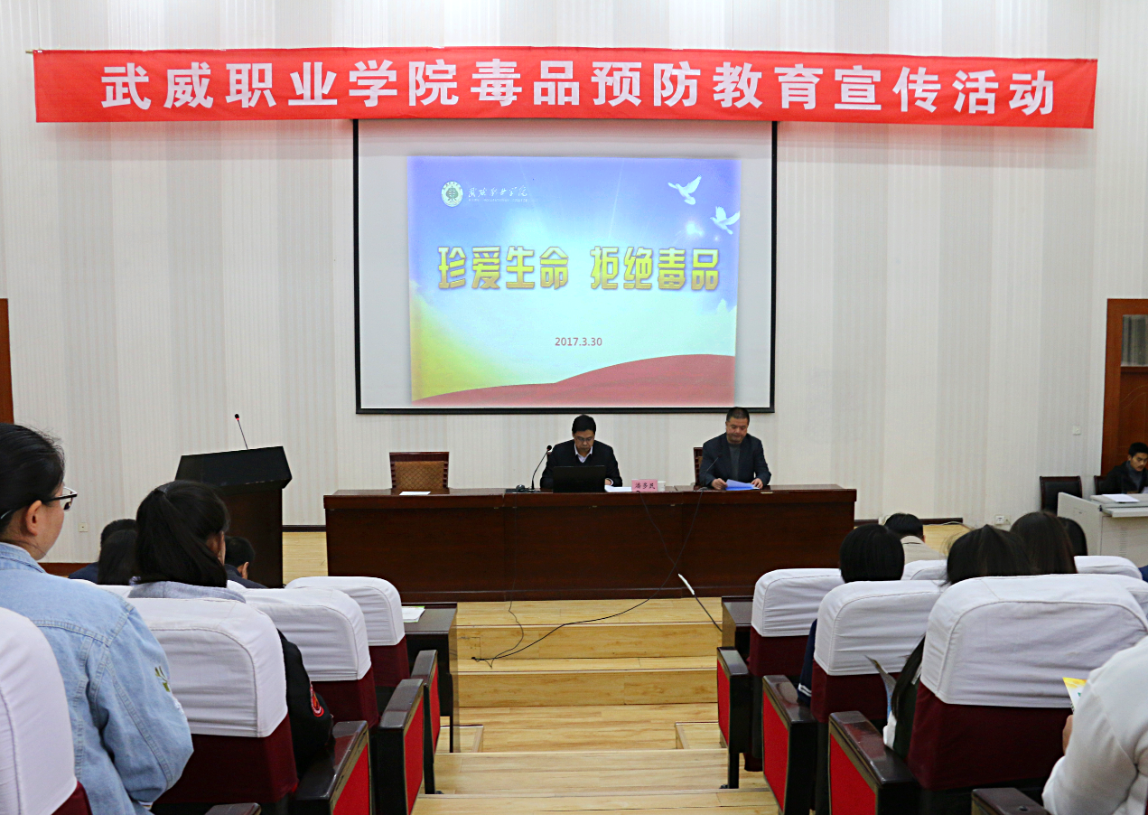 3月30日下午,院團(tuán)委聯(lián)合學(xué)生工作處、保衛(wèi)處在正德廳舉辦武威職業(yè)學(xué)院毒品預(yù)防教育宣傳活動(dòng),團(tuán)市委書(shū)記潘多民出席活動(dòng)并授課,學(xué)院各級(jí)團(tuán)干部270多人參加了活動(dòng)。活動(dòng)由學(xué)生工作處處長(zhǎng)王守云主持。