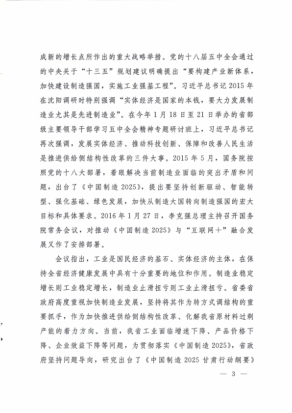 2016 年 1 月 30 日,省委副書記、省長、中國制造 2025甘肅行動綱要協(xié)調(diào)推進(jìn)領(lǐng)導(dǎo)小組組長劉偉平主持召開了協(xié)調(diào)推進(jìn)領(lǐng)導(dǎo)小組第一次會議,研究部署我省行動綱要的協(xié)調(diào)和推進(jìn)工作?,F(xiàn)將《中國制造 2025 甘肅行動綱要協(xié)調(diào)推進(jìn)領(lǐng)導(dǎo)小組第一次會議紀(jì)要》轉(zhuǎn)發(fā)你們。