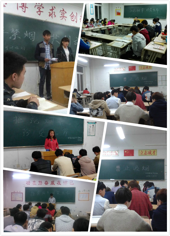 在班會(huì)中,各班主任向同學(xué)們宣讀了學(xué)院《關(guān)于在校園內(nèi)公共場(chǎng)所戒煙的通知》和《校園禁煙倡議書》,并提出作為一名學(xué)生,除了要有遠(yuǎn)大的理想、高尚的情操、淵博的知識(shí)、嚴(yán)謹(jǐn)?shù)募o(jì)律作風(fēng)外,還要有一個(gè)健康的身體。為了我們的健康,我們呼吁,同學(xué)們應(yīng)自覺的遠(yuǎn)離香煙,并勸說吸煙的親友盡快戒煙。讓我們每一位同學(xué)做出承諾,自覺拒絕煙草,遠(yuǎn)離煙草危害。堅(jiān)決不吸煙,拒吸第一支煙,勸告他人不吸煙,不做吸煙的新一代。人人爭(zhēng)做文明、健康、遵紀(jì)守法的好學(xué)生,使每一位師生都擁有一個(gè)健康的生活環(huán)境。