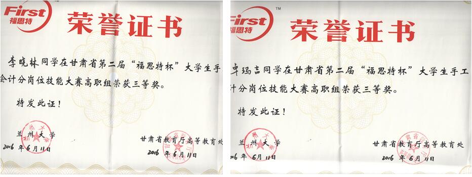 經(jīng)濟(jì)管理系會(huì)計(jì)電算化大專班四名學(xué)生在李惠蘭老師帶領(lǐng)下于2016年6月10日赴蘭州大學(xué)參加了甘肅省第二屆“福思特”大學(xué)生手工會(huì)計(jì)分崗位技能競(jìng)賽。