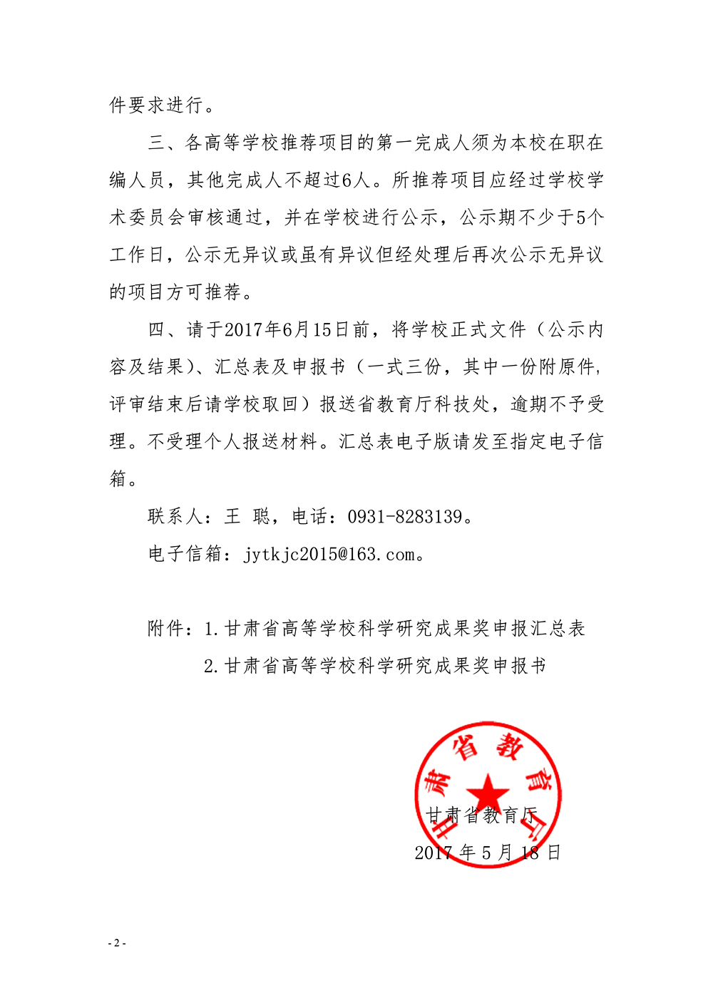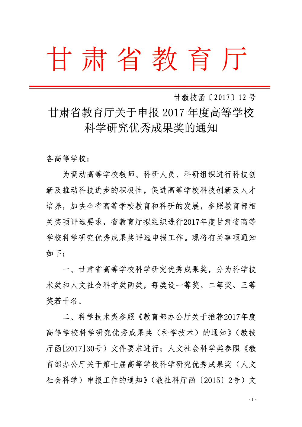 轉(zhuǎn)發(fā)甘肅省教育廳關(guān)于申報2017年度高等學(xué)校科學(xué)研究優(yōu)秀成果獎的通知