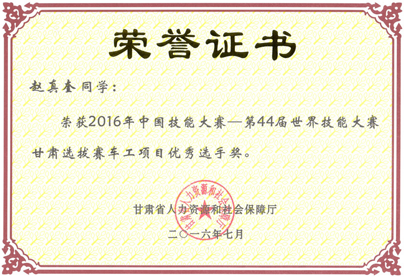 - 上一篇:第44屆世界技能大賽甘肅選拔賽裝配鉗工項(xiàng)目優(yōu)秀獎[ 06-21 ]