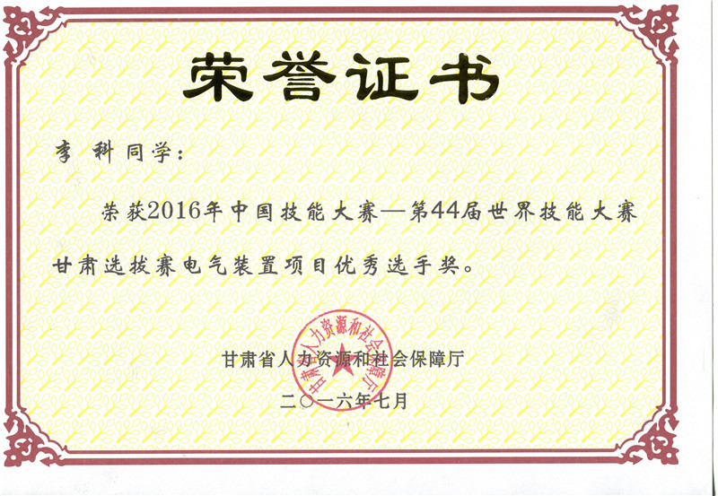 2016年中國技能大賽甘肅選拔賽電氣裝置項(xiàng)目優(yōu)秀獎(jiǎng)